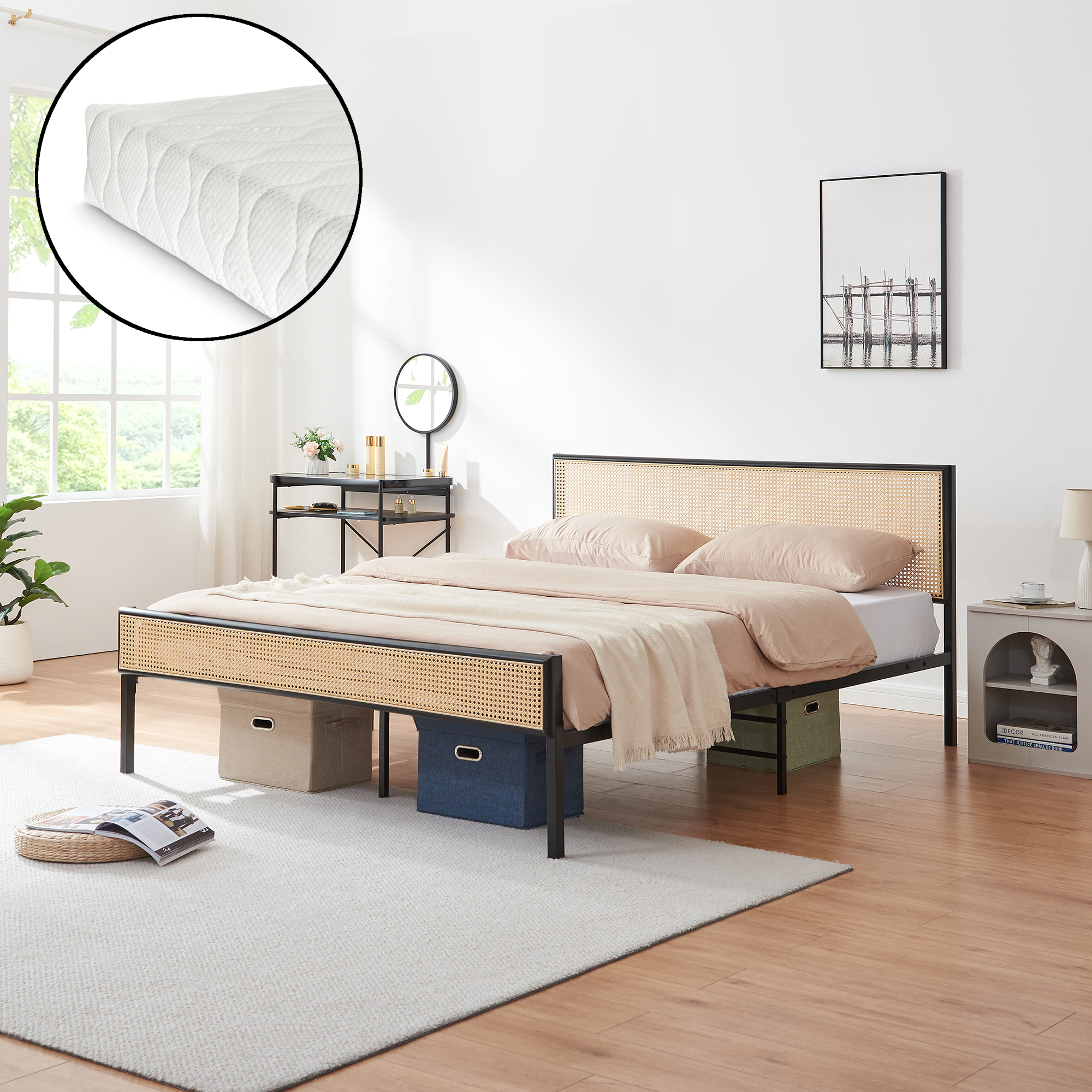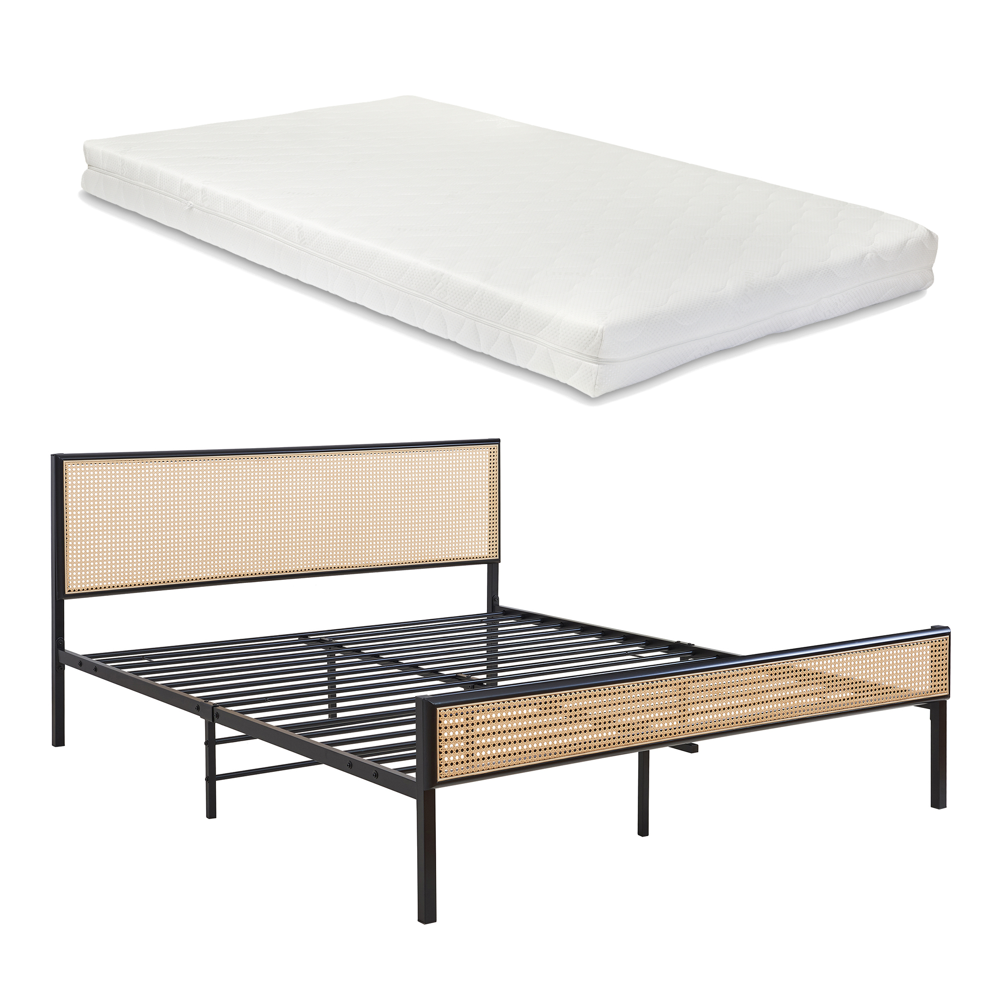 Pat metalic 160x200 cm cu saltea inclusă – o alegere inspirată pentru un dormitor modern, aerisit și primitor. Modelul Linköping combină eleganța unui pat metalic rezistent cu farmecul detaliilor în aspect ratan, oferind un plus de stil și confort în fiecare noapte.