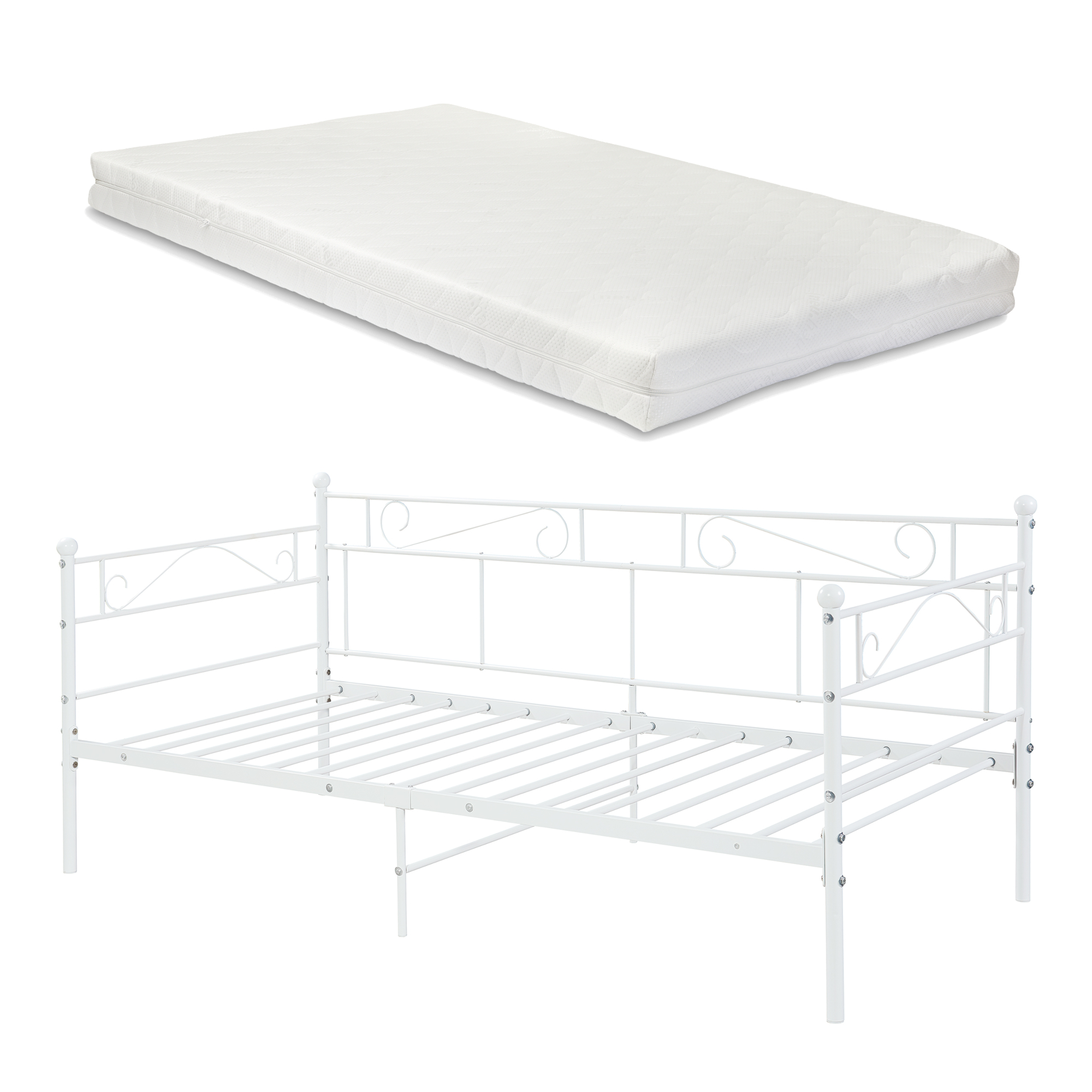Patul metalic Granada cu saltea 90x200 cm este o alegere practică și elegantă pentru dormitor, camera de oaspeți sau un spațiu mai mic. Designul său aerisit, cu linii decorative curbate, adaugă un plus de farmec încăperii, iar nuanța albă se integrează ușor în decoruri moderne, clasice sau romantice.