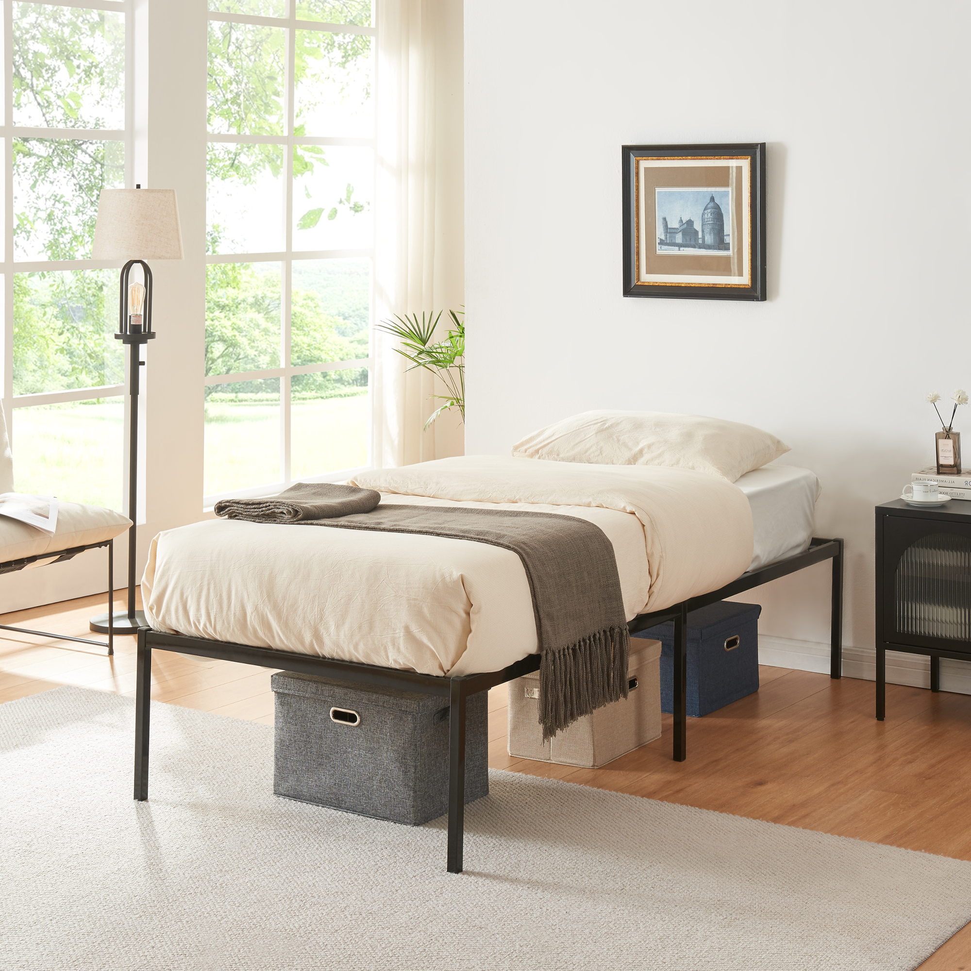 Conceput pentru confort si functionalitate, acest pat 90x200 cm are un cadru robust si bare metalice solide care sustin eficient salteaua si ajuta la obtinerea unui somn odihnitor. Suprafata este rezistenta la zgarieturi, socuri si uzura, fiind in acelasi timp usor de curatat cu o laveta umeda. In plus, spatiul de sub pat poate fi folosit pentru depozitare, asa cum se observa si in imaginile produsului.