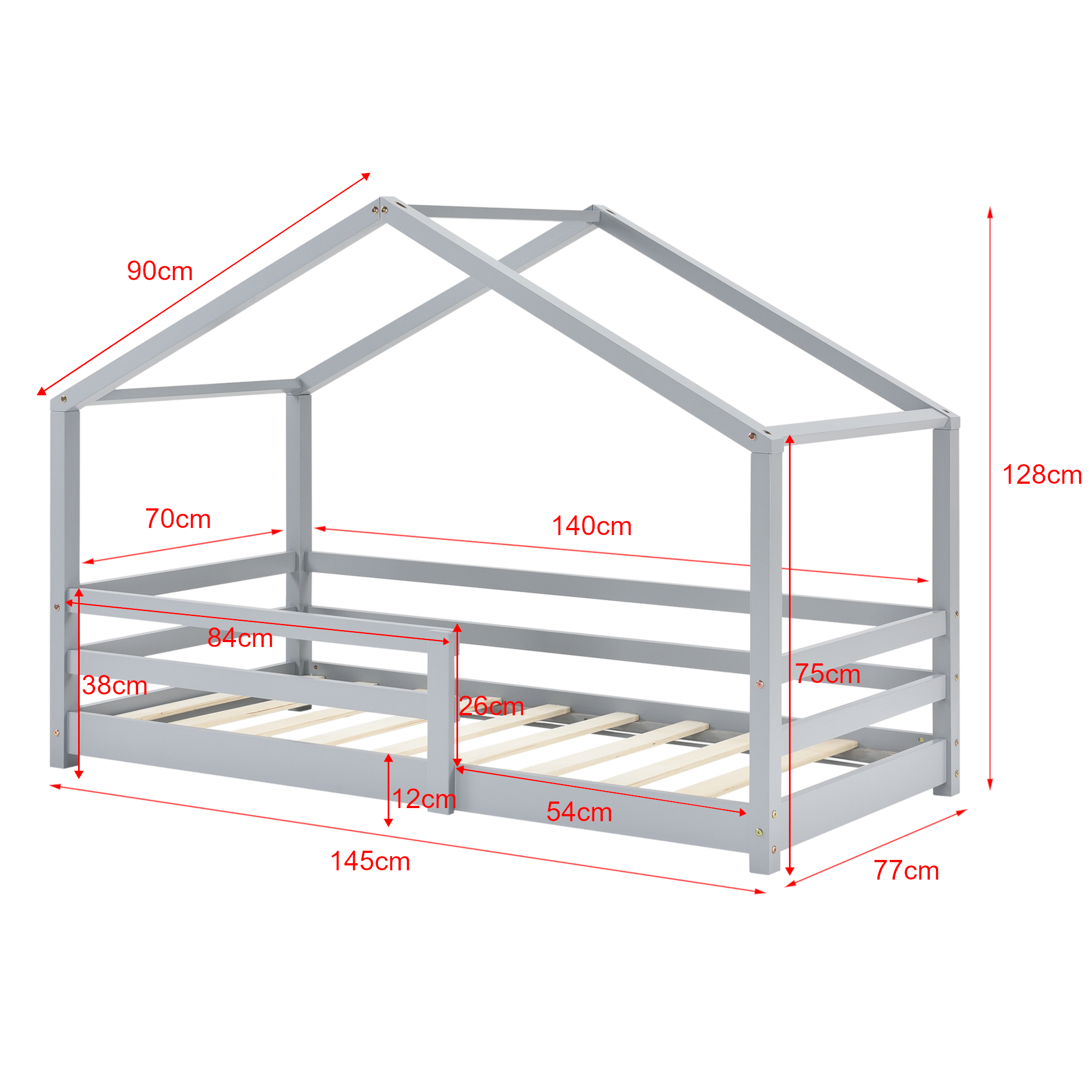 Designul în formă de casă oferă un aspect decorativ modern și prietenos, iar protecția anti-cădere contribuie la un plus de siguranță în timpul somnului. Construcția stabilă și montajul facil îl fac potrivit pentru utilizarea de zi cu zi, fiind o soluție practică pentru părinți și confortabilă pentru cei mici.