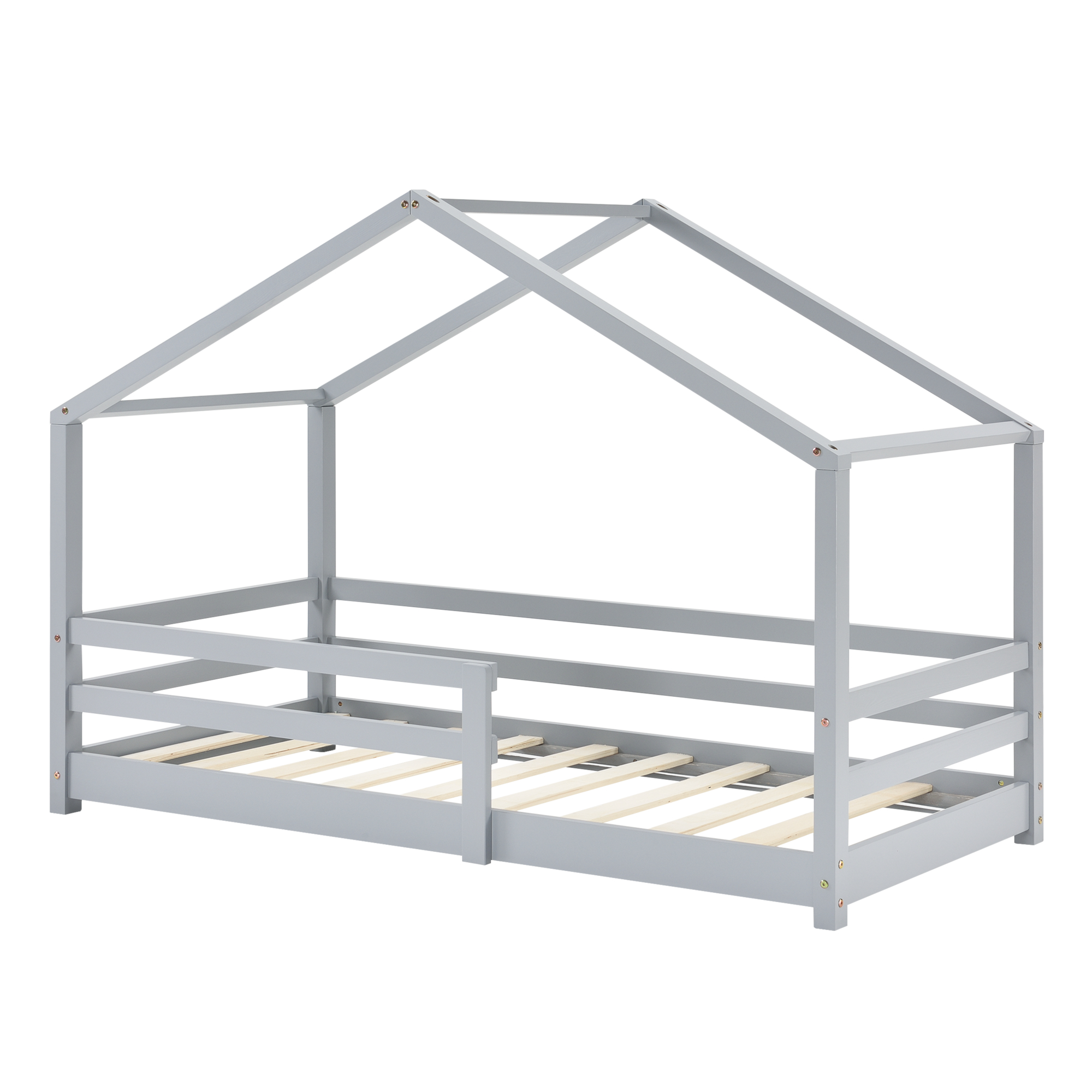 Pat pentru copii tip căsuță 70x140 cm, gri deschis, din lemn de pin