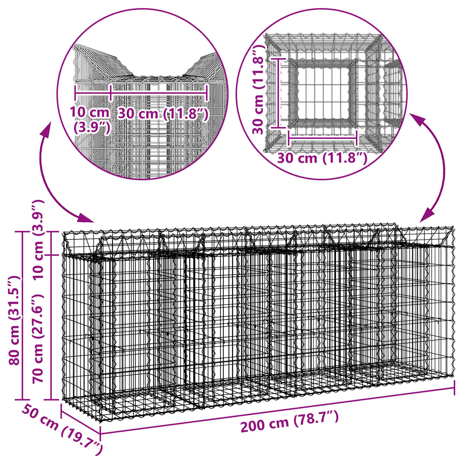Pat ridicat din gabion 2 pcs Argintiu 200 x 50 x 80 cm GartenMobel Dekor