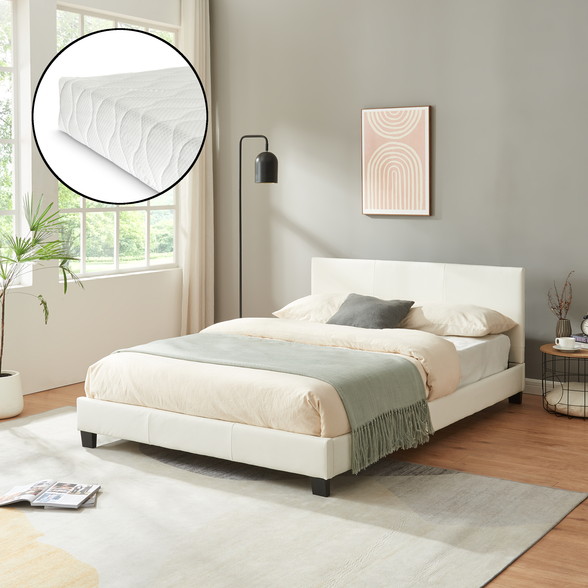 Pat tapitat 140x200 Albacete este alegerea potrivita daca iti doresti un dormitor luminos, modern si confortabil. Designul sau simplu si elegant, finisat in alb mat, se integreaza usor in amenajari contemporane, minimaliste sau clasice. In plus, setul include si o saltea 140x200, astfel incat te poti bucura mai repede de un spatiu complet pentru odihna.