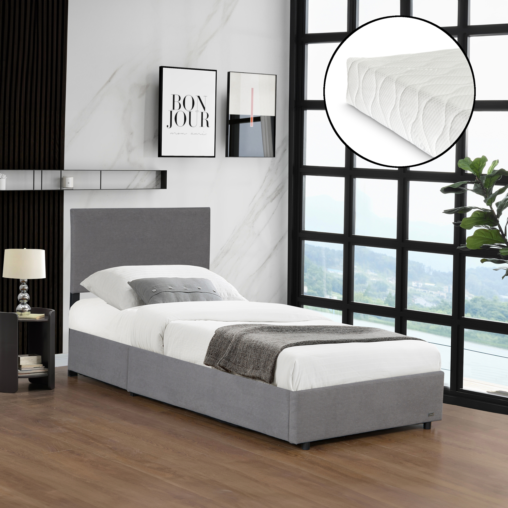 Acest pat gri cu ladă și saltea inclusă este potrivit atât pentru dormitorul personal, cât și pentru camera de oaspeți. Oferă un echilibru excelent între estetică, funcționalitate și confort, fiind o soluție practică pentru spațiile în care fiecare centimetru contează.