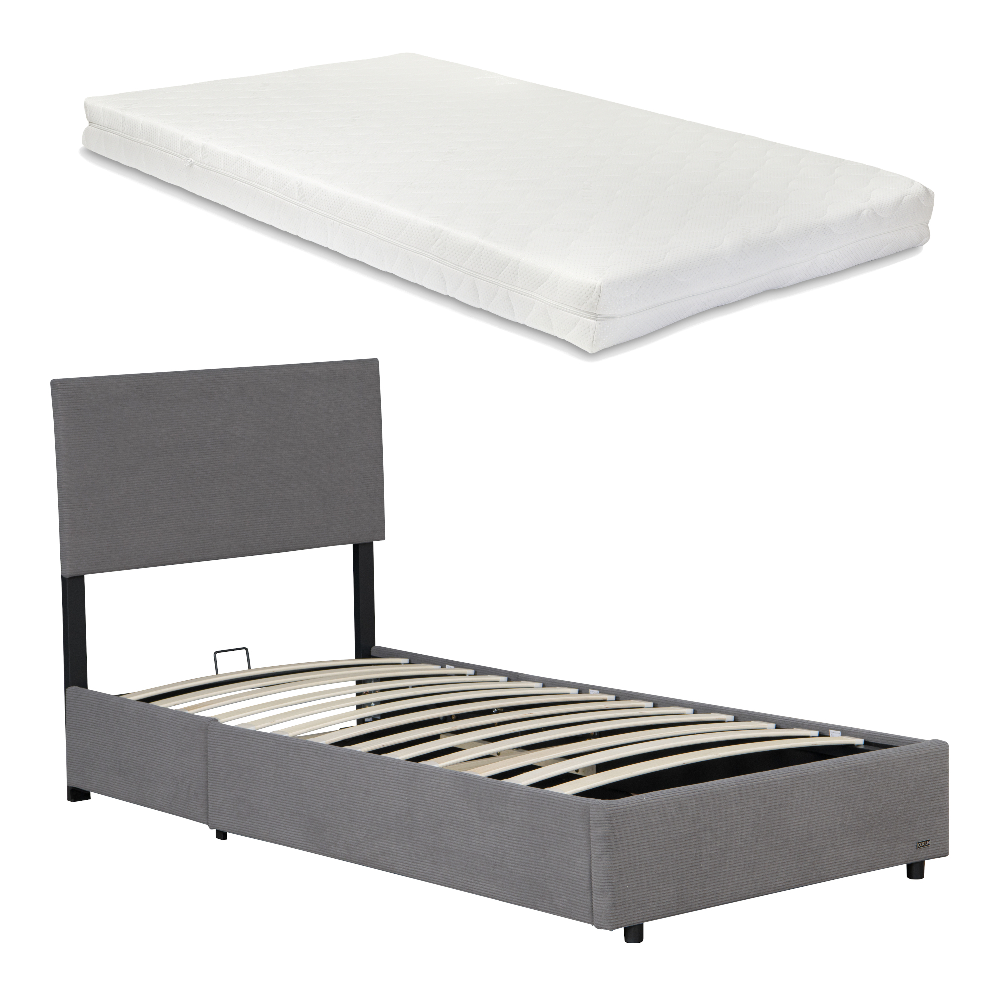 Pat tapitat Juva 90x200 cm cu saltea și ladă de depozitare, gri