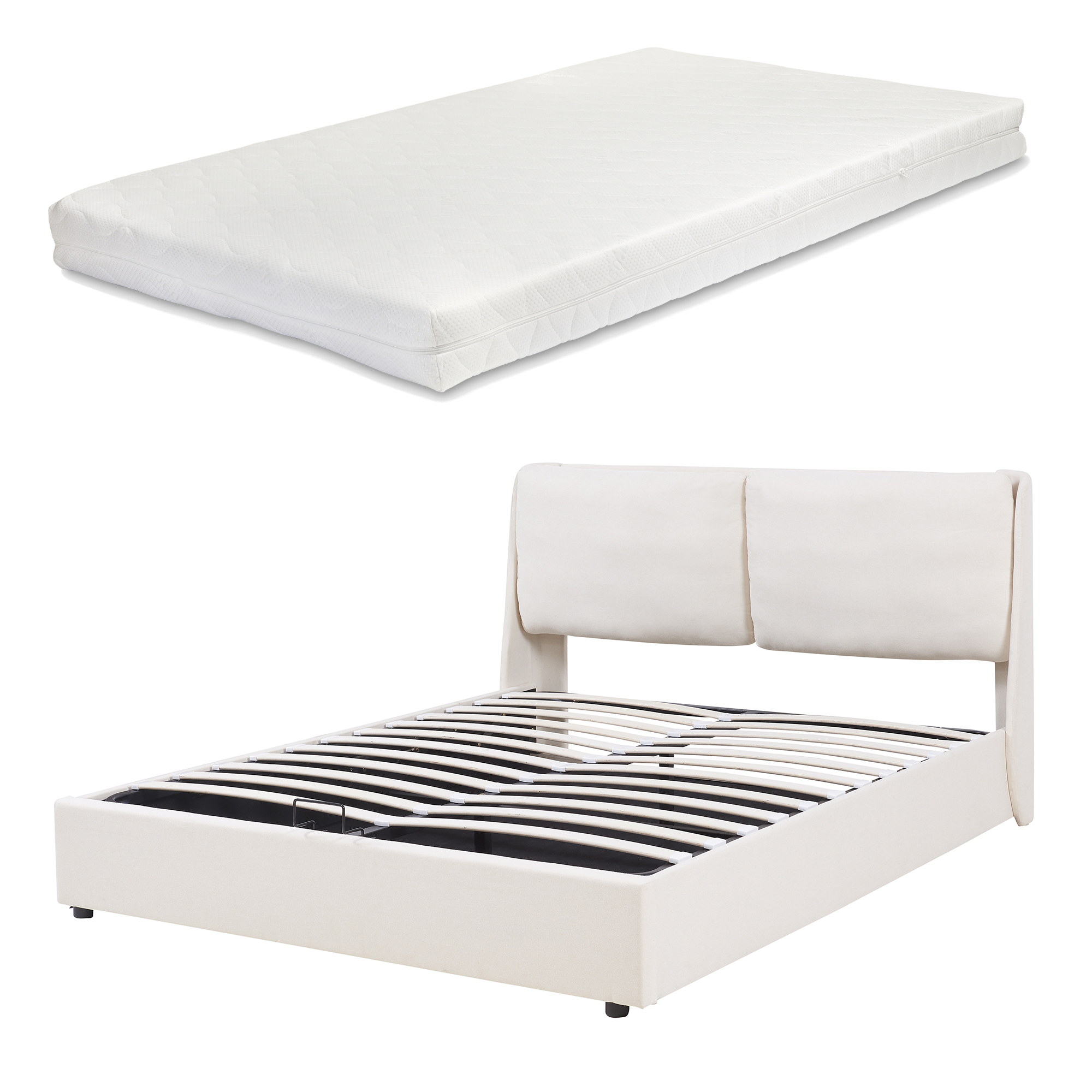 Pat tapițat Lunner 160x200 cm bej cu saltea și ladă de depozitare