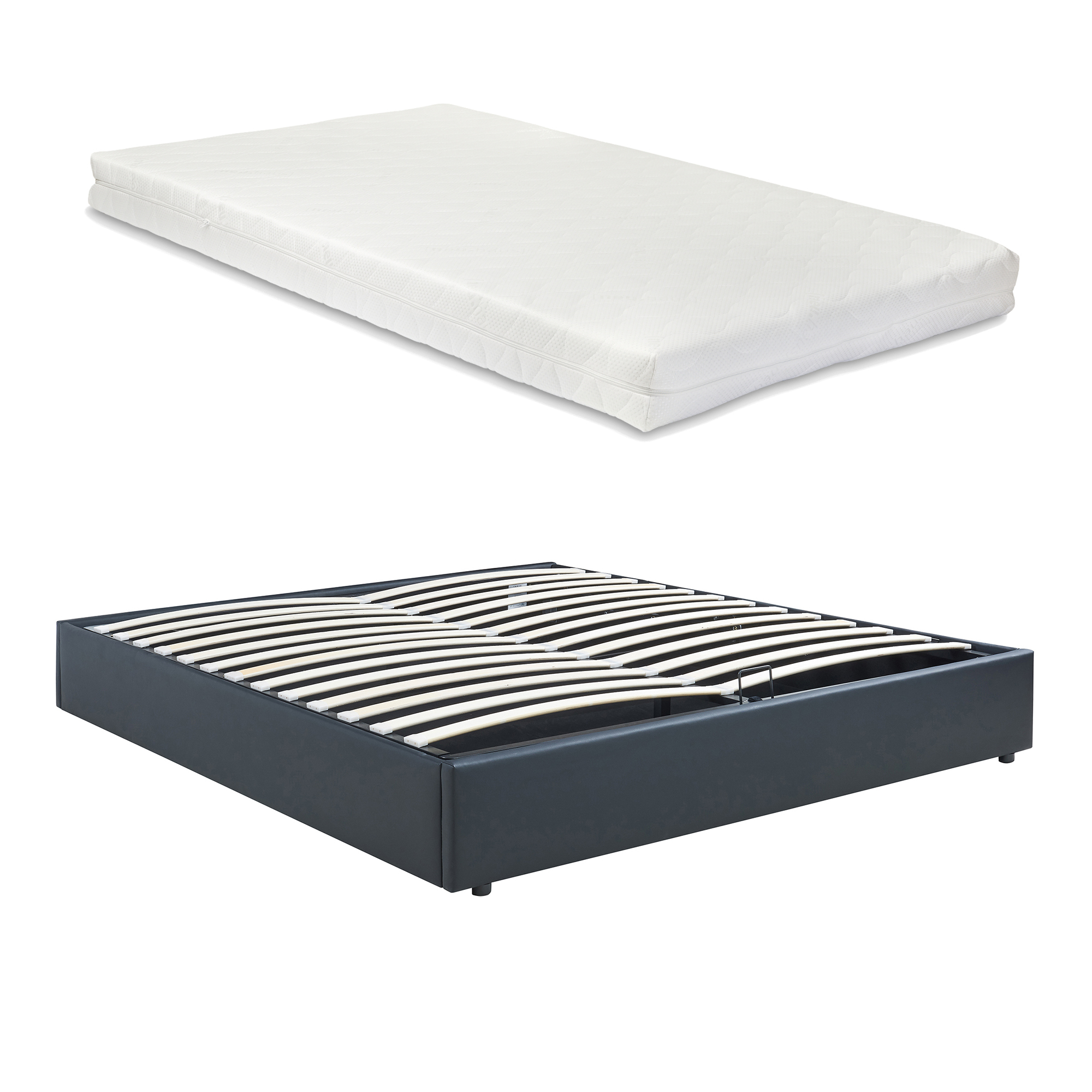 Setul include atât patul matrimonial cu saltea, cât și o somieră rabatabilă cu mecanism practic pe bază de pistoane cu gaz. Sub somieră se află o ladă de depozitare generoasă, ideală pentru lenjerii, perne, pături sau alte articole pe care vrei să le păstrezi la îndemână, fără a aglomera camera.