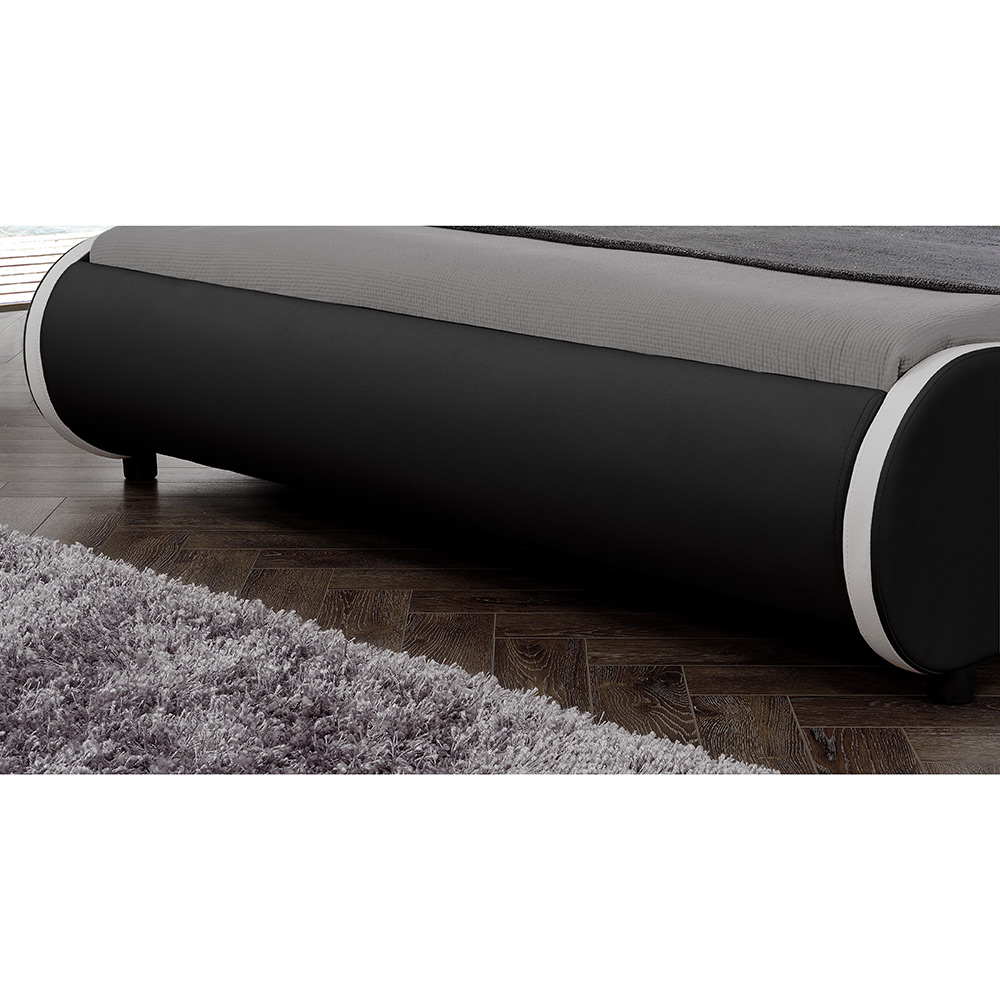 Transformă dormitorul într-un spațiu modern și confortabil cu acest pat tapițat 180x200 Valencia, realizat din piele ecologică mată, în nuanță elegantă de negru cu margine albă contrastantă. Tăblia înaltă, extra capitonată, oferă un plus de confort la sprijin, iar sistemul de iluminare LED RGB integrat creează o atmosferă plăcută și contemporană.