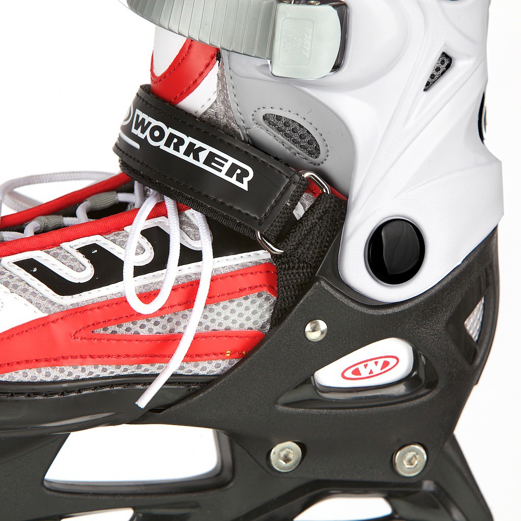 Patine WORKER Nolan 2 in 1- Rosu cu lame din otel certificat care se pot inlocuii cu patine in linie amandoua find pe o sina de aluminiu. Datorita sistemului patentat de ajustare rapida a marimii Patinele WORKER Nolan 2 in 1- Rosu sunt una dintre cele mai versatile patine 2in1. Gheata interioara are sistem Comfort Fit. Tehnologia Safety Ankle tine ferm glezna in pozitia corecta. Usor de incaltat, sireturile si cataremele duble cu MicroLock asigura o utilizare confortabila a acestor patine. Un alt avantaj important este frana detasabila pe patina dreapta si rulmentii de calitate ABEC 5.