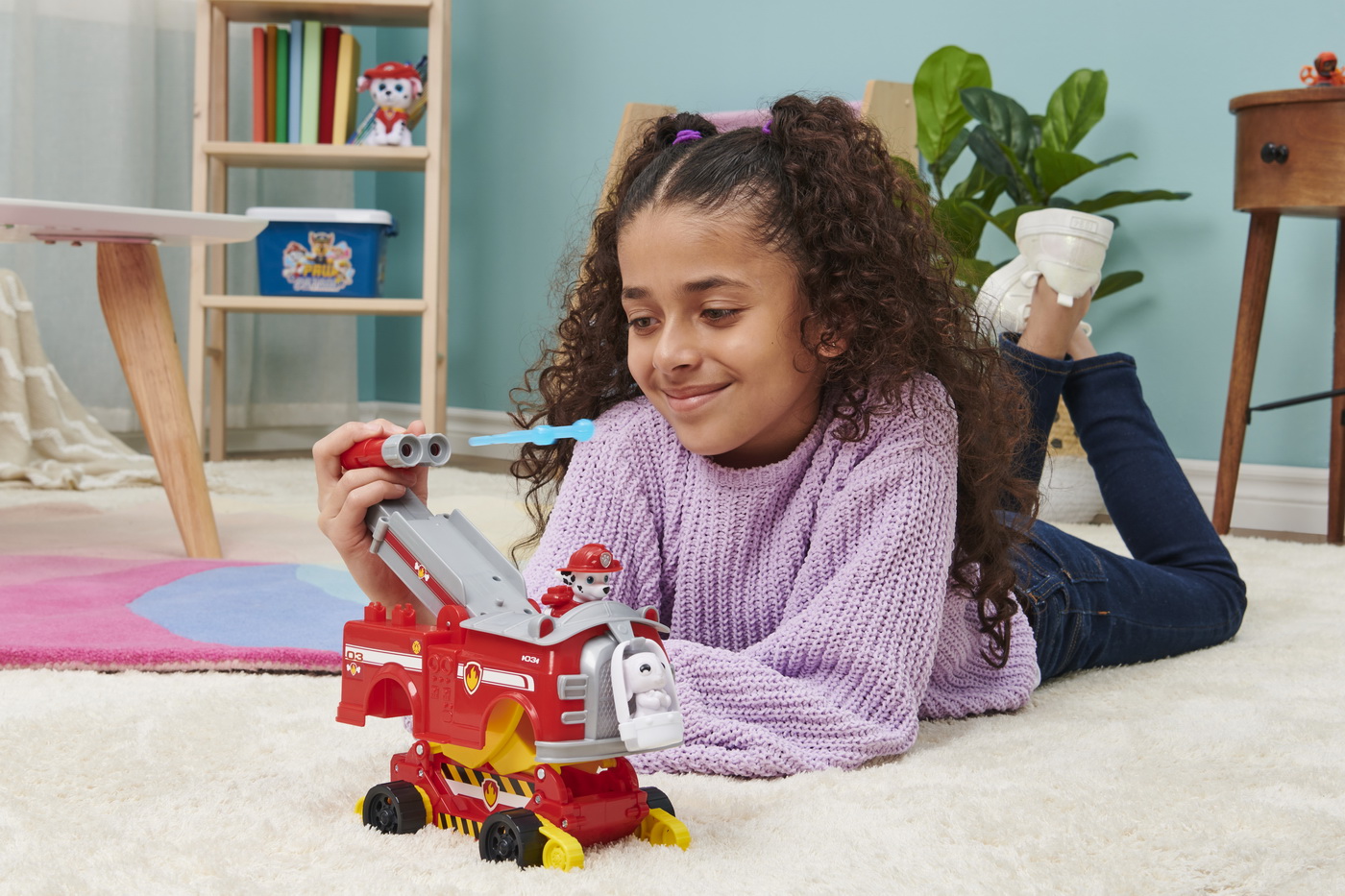 Porneste la salvare cu seriful din patrula catelusilor si vehiculul sau de salvare! Autospeciala de pompieri a serifului Marshall are grafica si detalii autentice, o zona de depozitare pentru accesorii si o transformare interesanta de salvare. Cand vine timpul pentru o salvare palpitanta, pune-ti figurina Marshall pe scaunul soferului si porneste cu viteza in misiunea ta. Odata ce ajungi, apasa pe vehicul pentru a intra in modul de salvare - vehiculul se ridica, pentru a dezvalui lansatoarele de proiectile si drona de salvare, oferindu-i in acelasi timp lui Marshall vederea perfecta pentru o salvare palpitanta! Lanseaza proiectilele de apa pentru a indeparta obstacolele. Pentru misiuni de salvare in locuri greu accesibile, deschide compartimentul de depozitare din spatele vehiculului si trimite drona de salvare a lui Marshall si cosul de recuperare pentru a o duce pe Chickaletta in zbor in siguranta! (figurina inclusa) Dupa ce Chickaletta a fost salvata, agata cosul in partea din fata a vehiculului pentru a-i oferi un loc sigur in care sa calatoreasca pe drumul de intoarcere spre casa. Da viata salvarilor tale pline de actiune, in timp ce iti folosesti imaginatia pentru a-ti indeplini misiunile. Pentru si mai multe aventuri de salvare, cauta vehiculul Chase porneste si salveaza (vandut separat). Jucariile cu vehicule Porneste si Salveaza pentru baieti si fetite de 3 ani sunt cadourile perfecte pentru copii. Formeaza o echipa cu catelusul tau favorit din patrula catelusilor si Marshall, si salveaza ziua cu vehiculul sau de ridicare si salvare!