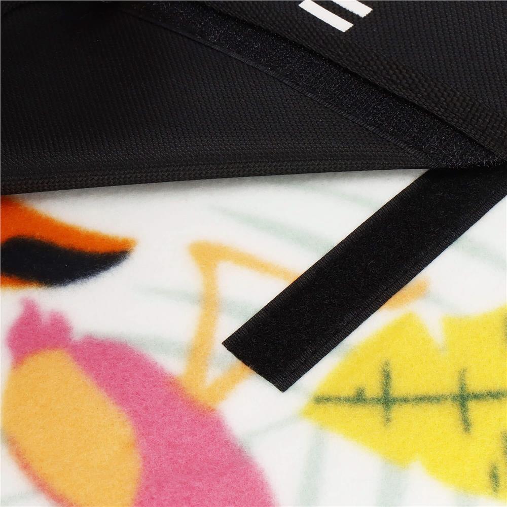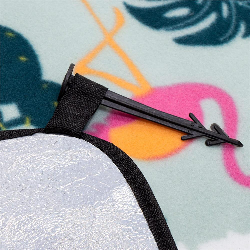 Modelul tropical aduce un plus de stil ieșirilor în aer liber, fie că mergi la mare, în parc, la camping sau în grădină. Pătura se pliază compact, se închide cu velcro și are mâner de transport reglabil, astfel încât să o poți lua ușor cu tine. În plus, buzunarul cu fermoar este util pentru obiecte mici, iar ancorele incluse ajută la fixarea pe sol.