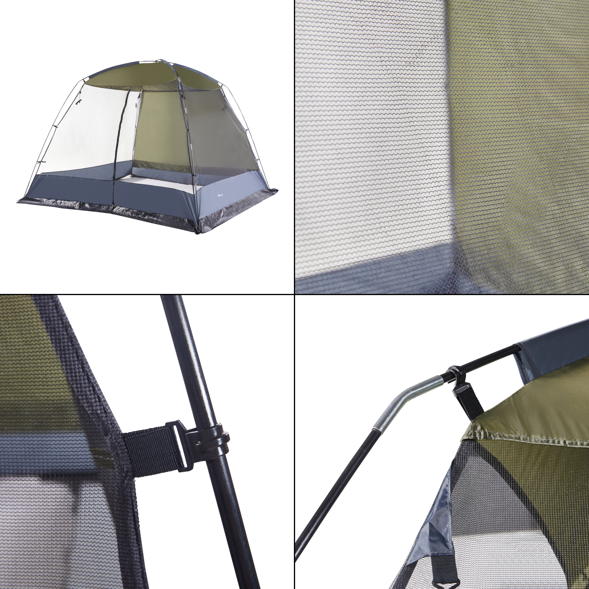 Datorita plaselor de tantari respirabile prevazute cu fermoar, te poti bucura de aer curat si confort, fara grija insectelor. Materialul impermeabil si structura stabila il transforma intr-un pavilion de exterior versatil, usor de transportat cu ajutorul gentii incluse.