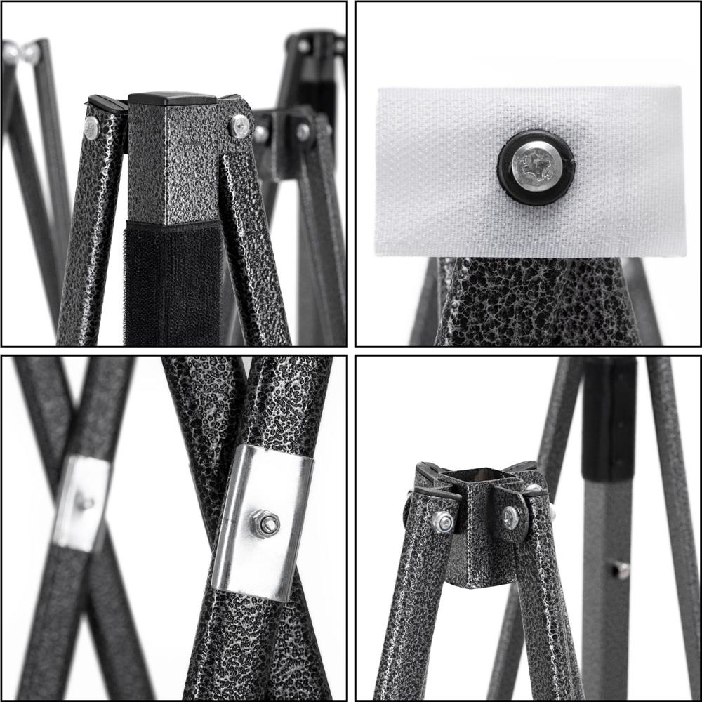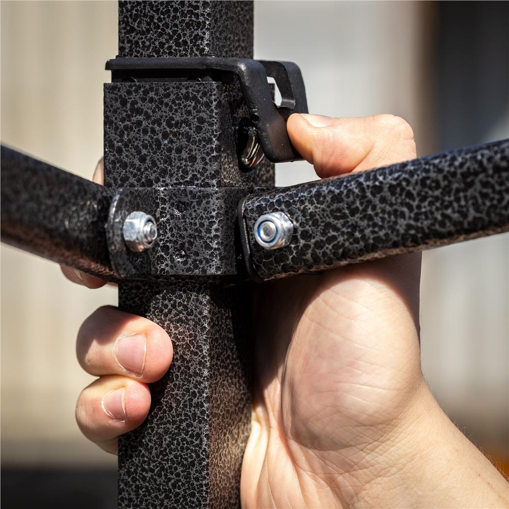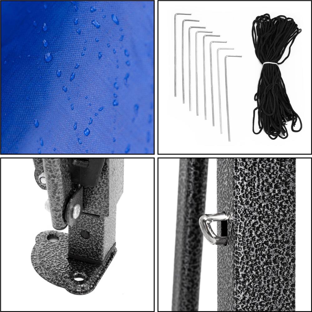 Specificatii tehnice: Material structura: Otel Material acoperis si pereti: Poliester Oxford 420D cu strat hidrofob Culoare: Bleumarin, negru Suprafata acoperita: 300 x 300 cm Inaltime maxima: 310 cm Dimensiuni pavilion montat: Lungime: 300 cm Latime: 300 cm Inaltime totala reglabila: 280 / 290 / 300 / 310 cm Inaltime pereti laterali reglabila: 195 / 205 / 215 / 225 cm Dimensiuni pavilion pliat: Pavilion pliat: 16 x 16 x 145 cm Pavilion in husa: 20 x 20 x 148 cm Structura cadru: Profile picioare exterioare: 30 x 30 mm Profile picioare interioare: 25 x 25 mm Profile acoperis: 15 x 25 mm Profil stalp central: 26 x 26 mm Dimensiune talpa baza: 7 x 7 x 9 cm Distanta gauri fixare: 5,5 cm Diametru gauri fixare: 8 mm Toleranta dimensiuni: ±2% Scurta descriere: Pavilion pliabil pentru gradina, realizat cu structura metalica stabila si acoperis impermeabil. Ofera protectie impotriva soarelui si ploii usoare, fiind potrivit pentru curte, terasa sau evenimente in aer liber. Toate elementele pot fi depozitate intr-o singura husa. Caracteristici principale: Structura metalica cu tratament anticoroziv Material hidrofob care respinge apa Inaltime reglabila in mai multe trepte Montaj rapid fara unelte Pereti laterali detasabili Depozitare compacta in husa inclusa Continut pachet: Acoperis pavilion 3 pereti laterali de 3 m Structura metalica pliabila Husa de transport cu fermoar si manere 8 cuie de fixare 4 corzi de ancorare Instructiuni de montaj Instructiuni de intretinere: Nu se spala la masina sau manual Nu se folosesc detergenti sau inalbitori Nu se usuca in uscator Nu se calca Nu se curata chimic