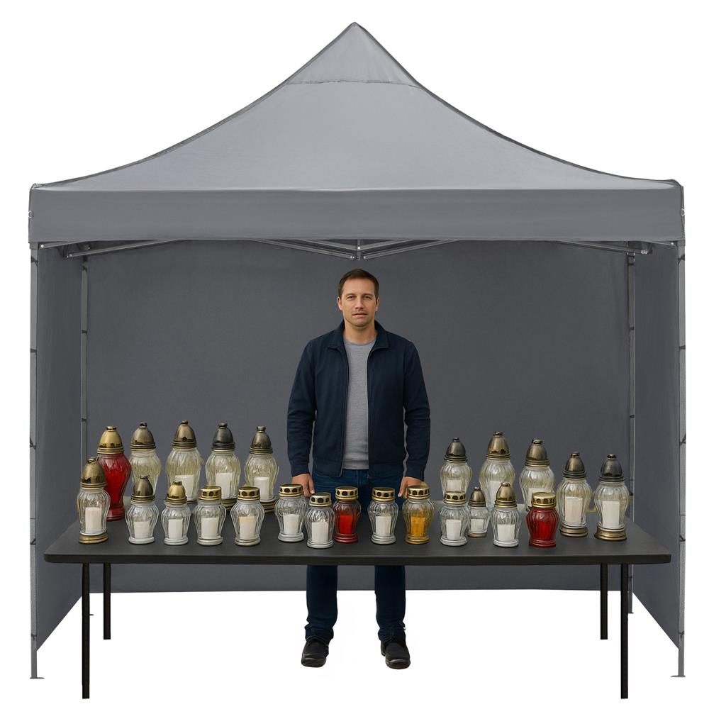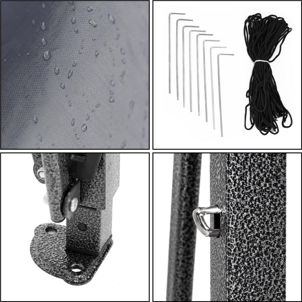 Specificatii tehnice: Material structura: Otel Material acoperis si pereti: Poliester Oxford 420D cu strat hidrofob Culoare: Gri, negru Suprafata acoperita: 300 x 300 cm Inaltime maxima: 310 cm Dimensiuni pavilion montat: Lungime: 300 cm Latime: 300 cm Inaltime totala reglabila: 280 / 290 / 300 / 310 cm Inaltime pereti laterali reglabila: 195 / 205 / 215 / 225 cm Dimensiuni pavilion pliat: Pavilion pliat: 16 x 16 x 145 cm Pavilion in husa: 20 x 20 x 148 cm Structura cadru: Profile picioare exterioare: 30 x 30 mm Profile picioare interioare: 25 x 25 mm Profile acoperis: 15 x 25 mm Profil stalp central: 26 x 26 mm Dimensiune talpa baza: 7 x 7 x 9 cm Distanta gauri fixare: 5,5 cm Diametru gauri fixare: 8 mm Toleranta dimensiuni: ±2% Scurta descriere: Pavilion pliabil pentru gradina cu structura metalica stabila si acoperis impermeabil. Ofera protectie eficienta impotriva soarelui si ploii usoare, fiind potrivit pentru curte, terasa sau evenimente in aer liber. Toate componentele se depoziteaza intr-o singura husa. Caracteristici principale: Structura metalica cu protectie anticoroziva Material hidrofob ce respinge apa Inaltime reglabila in mai multe trepte Montaj rapid fara unelte speciale Pereti laterali detasabili Depozitare compacta in husa inclusa Continut pachet: Acoperis pavilion 3 pereti laterali de 3 m Structura metalica pliabila Husa de transport cu fermoar si manere 8 cuie de fixare 4 corzi de ancorare Instructiuni de montaj Instructiuni de intretinere: Nu se spala la masina sau manual Nu se folosesc detergenti sau inalbitori Nu se usuca in uscator Nu se calca Nu se curata chimic
