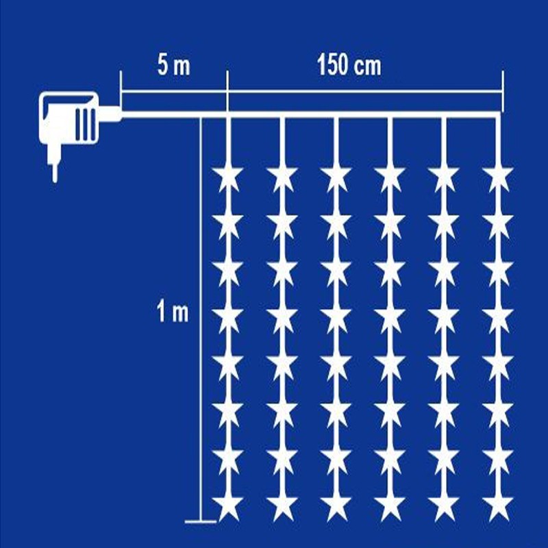 Ideala pentru a decora bradul de Craciun, fereastra sau vitrina unui magazin, aceasta perdea cu 48 de LED-uri sub forma unor stelute este destinata utilizarii in interior, avand o lungime de 1,5 m. Cele 48 de stelute au dimensiunea de 5 cm si sunt dispuse pe ghirlande cu o latime de 1 m.