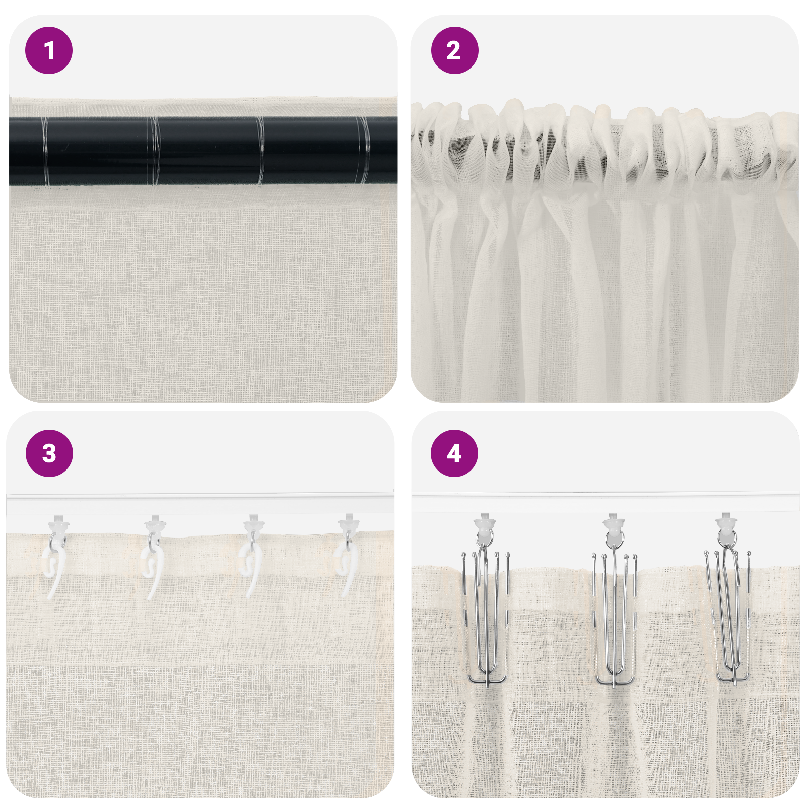 - Componente incluse: Fiecare set vine cu două draperii din voal care se deschid ușor și arată fabulos. Curgerea lor moale și designul opac oferă control maxim asupra luminii, fie că ești în apartamente aglomerate sau în case liniștite. Sunt gata de montat, adăugând rapid stil în decorul tău.