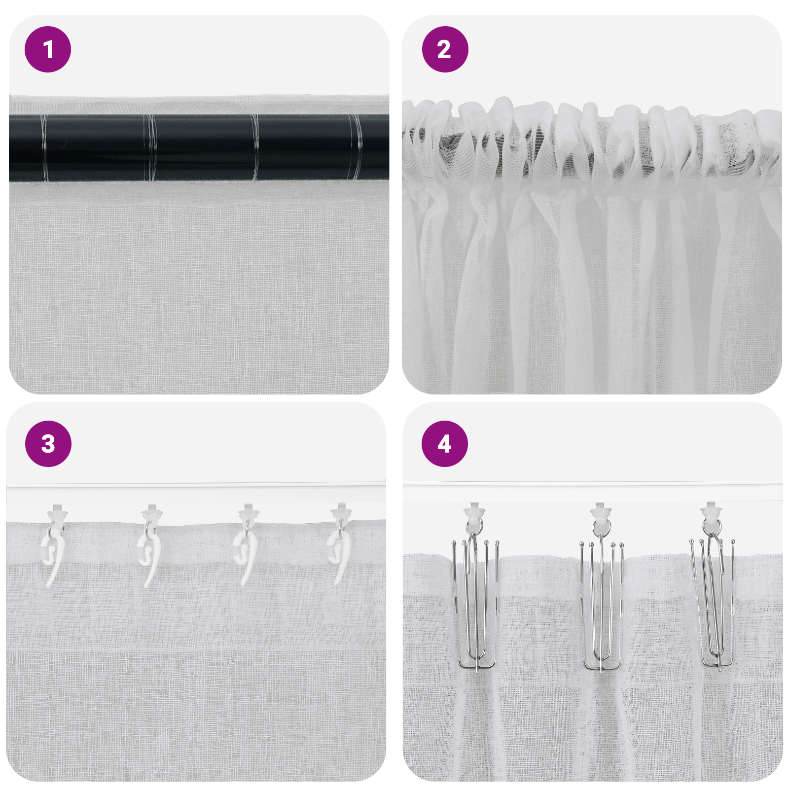 • Componente incluse: Fiecare set vine cu două draperii din voal care se deschid ușor și arată fabulos. Curgerea lor moale și designul opac oferă control maxim asupra luminii, fie că ești în apartamente aglomerate sau în case liniștite. Sunt gata de montat, adăugând rapid stil în decorul tău.