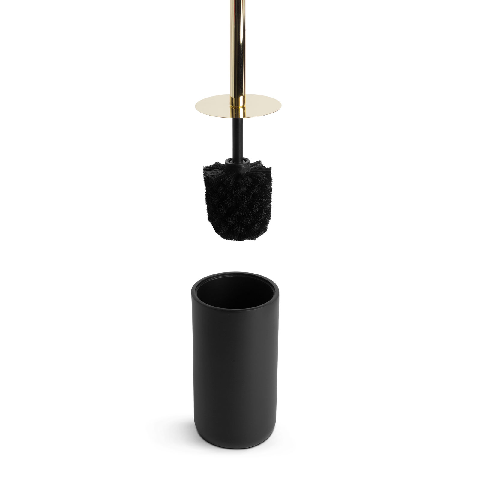 Setul elegant și practic de perii de toaletă + suport face baia și camera de toaletă și mai atractive cu o combinație de culori negru mat și auriu. Suportul din material rășină oferă stabilitate și durabilitate periei. Peria are un mâner auriu strălucitor care este ușor de utilizat și oferă o prindere confortabilă.