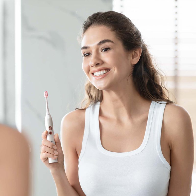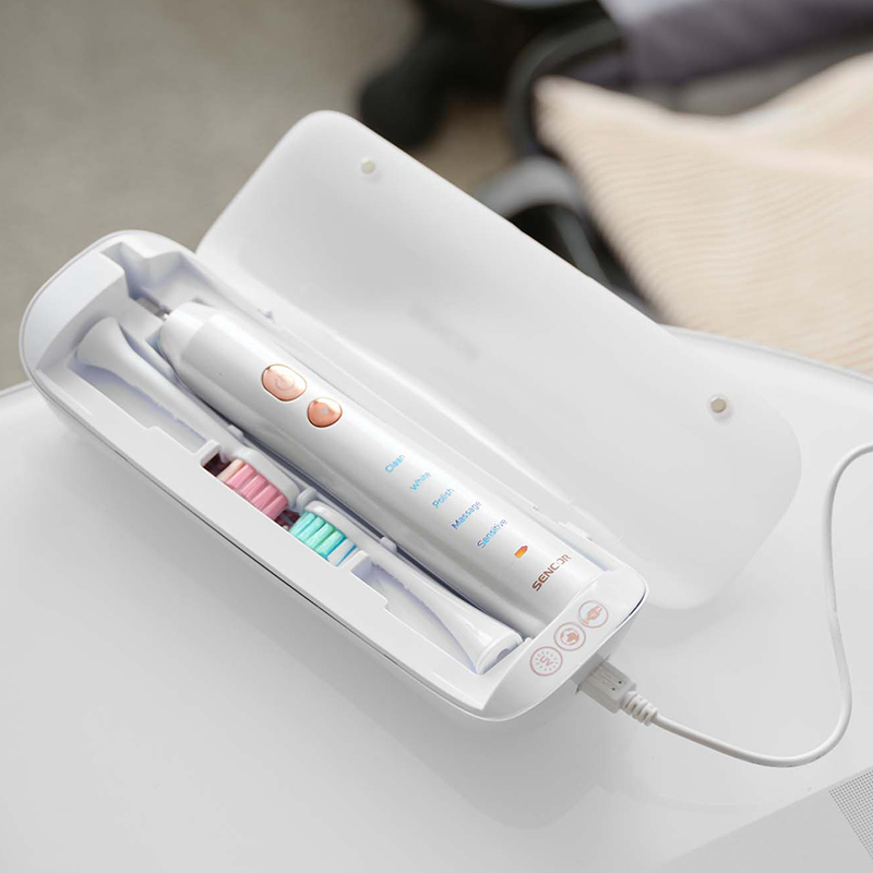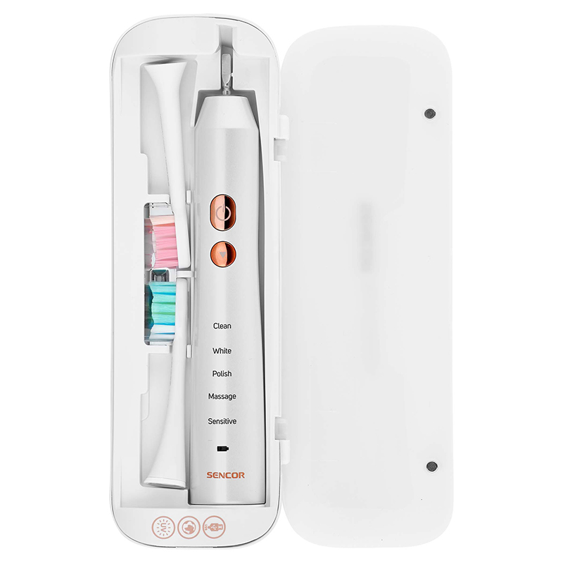 Îngrijire perfectă pentru dinți și gingii Periuța de dinți sonică SENCOR SOC 3313PW combină mișcarea oscilantă de înaltă frecvență și tehnologia sonică pentru o curățare perfectă. Cronometru inteligent Quadpacer Quadpacer împarte curățarea în 4 blocuri pentru o îngrijire dentară optimă. Viteza de răzuire este de până la 48.000 de vibratii pe minut. 5 programe presetate Periuța de dinți oferă 5 programe presetate pentru curățarea dinților și a gingiilor. Aceasta poate îndepărta placa de câteva ori mai bine decât periajul normal. Geantă de călătorie practică Husa de călătorie este dotată cu un conector USB și un sterilizator UV pentru dezinfectarea capetelor de curățare. Durata de viață a bateriei de până la 45 de zile Cu o curățare zilnică, bateria durează până la 45 de zile. Indicatorul LED al bateriei vă arată când periuța de dinți trebuie să fie încărcată. Design ergonomic Mânerul cu formă ergonomică asigură o manevrare confortabilă. De asemenea, peria este extrem de silențioasă datorită tehnologiei magnetice de izolare fonică. Protecție impermeabilă Periuța de dinți are un grad de impermeabilitate IPX7, care garantează protecția împotriva scufundării în apă. Capete de perie înlocuibile Peria este prevăzută cu capete de perie interschimbabile pentru o igienă maximă.