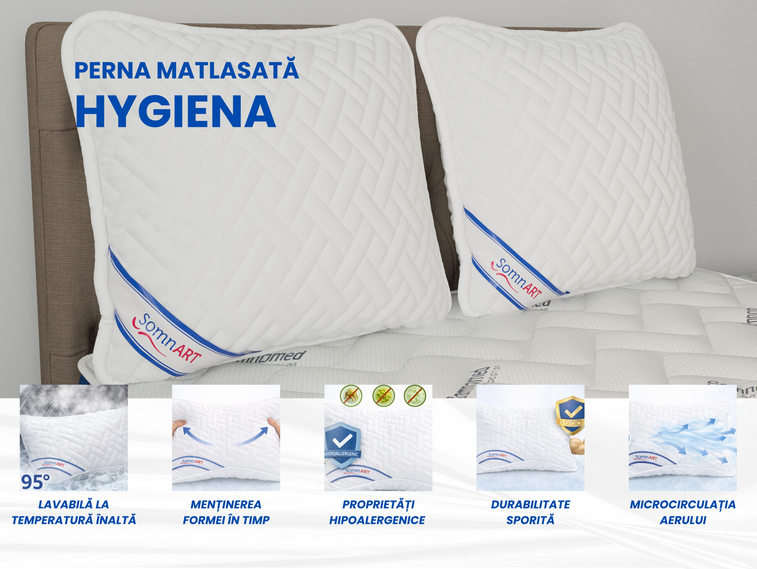 Alege o perna 70x70 cm hipoalergenica conceputa pentru confort zilnic si igiena excelenta. Modelul Somnart Hygiena este umplut cu bilute Superball din 100% fibra poliester, care ajuta la mentinerea formei si ofera o sustinere placuta, cu fermitate medie spre tare. Tesatura din microfibra periata si suprafata matlasata contribuie la un somn mai confortabil, indiferent de pozitia preferata.