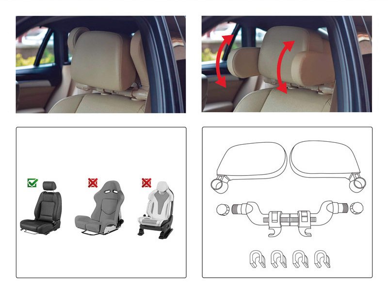 Se fixează pe tijele tetierei auto, apoi se reglează în funcție de distanța dintre bare și de poziția dorită. Suporturile laterale pot fi ridicate sau coborâte pentru a oferi sprijin optim capului atunci când pasagerul se odihnește.