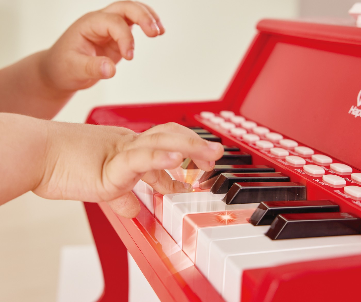 Ofera-i celui mic un mod distractiv de a descoperi muzica cu acest pian electronic pentru copii Hape, in nuanta rosie, cu design atragator si functii interactive. Cele 25 de clape luminate il ajuta pe copil sa invete primele melodii usor, chiar si fara cunostinte muzicale. Este o alegere excelenta pentru dezvoltarea coordonarii, a creativitatii si a increderii in sine prin joaca.