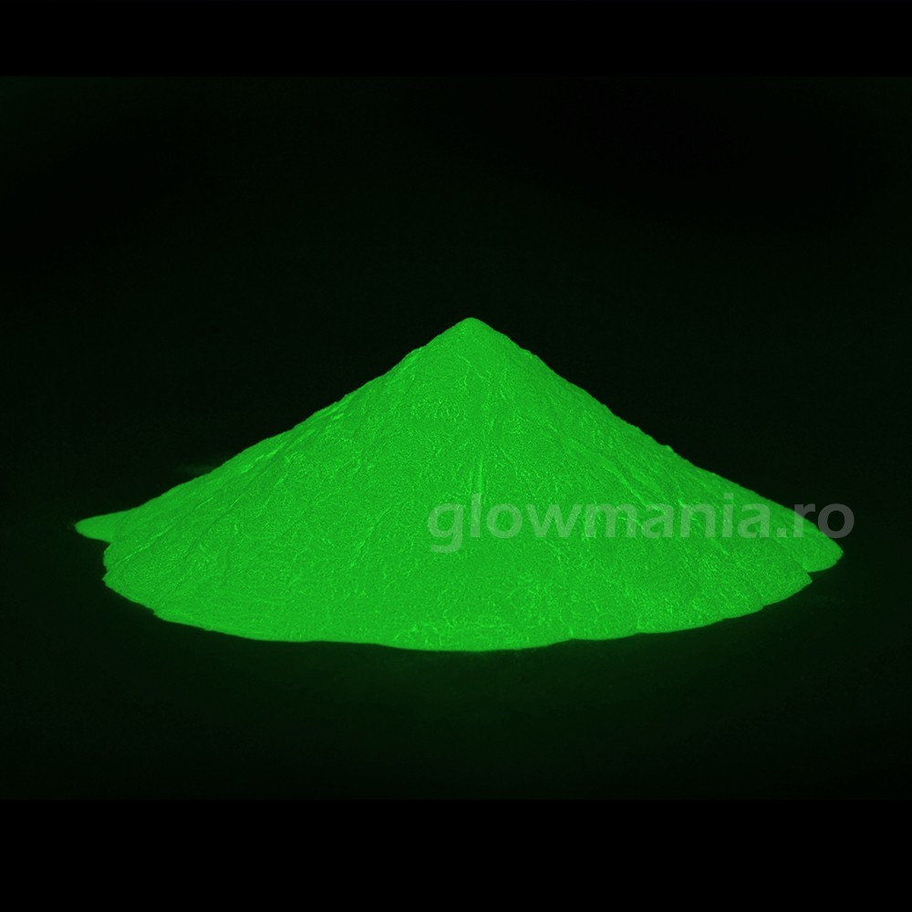 Pigment fosforescent verde baza de apa adaugat in orice compozitie poate sa lumineze verde intens intre 8 si 12 ore dupa o incarcare la orice sursa de lumina: bec cu incandescenta, lumina solara, lampa UV, lampa flourescenta, etc.