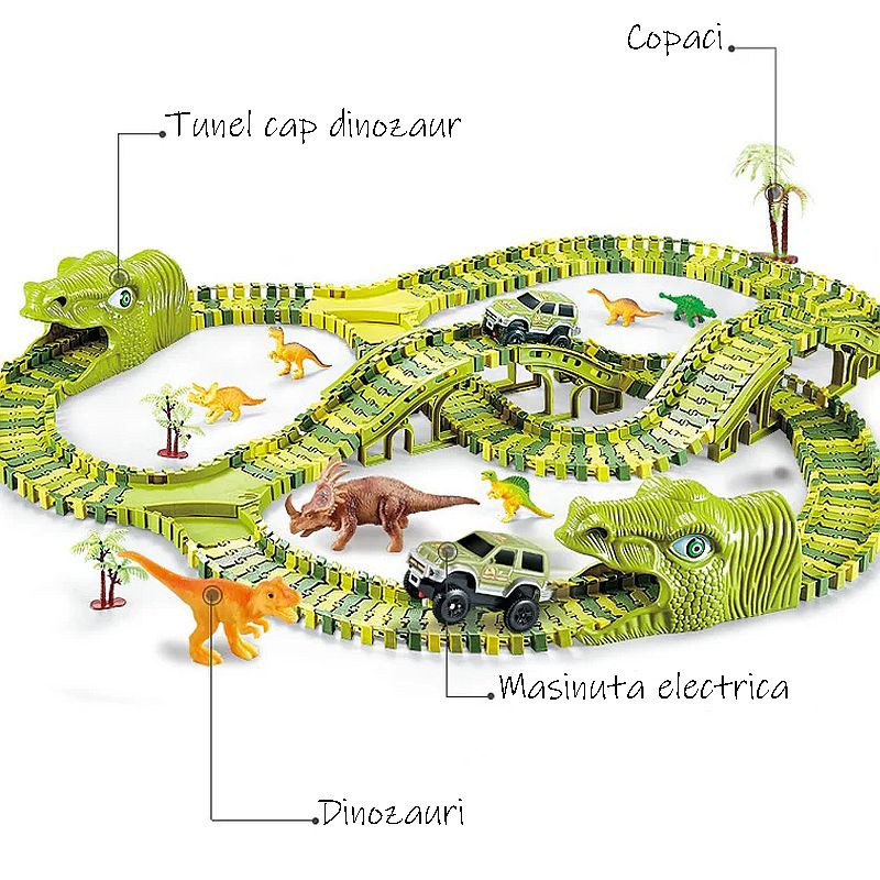 Aceasta jucarie pentru copii contine multiple piese care formeaza o pista circuit uriasa pentru masinute si totodata un parc de dinozauri cu 8 specii diferite, elemente de decor si o masinuta electrica.