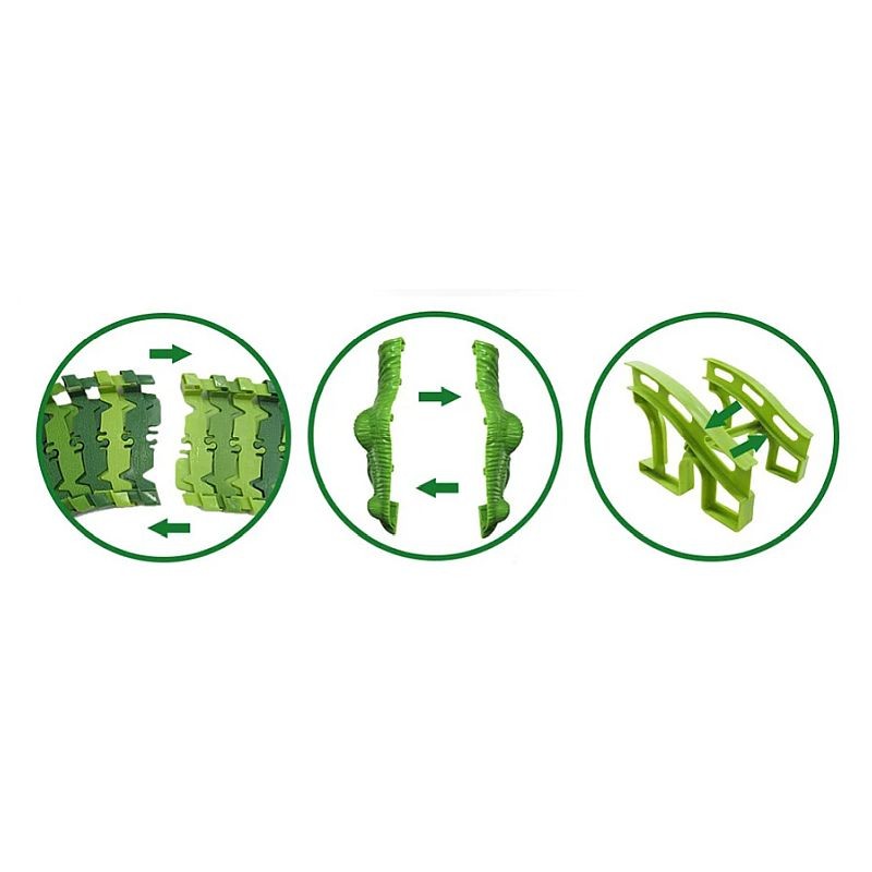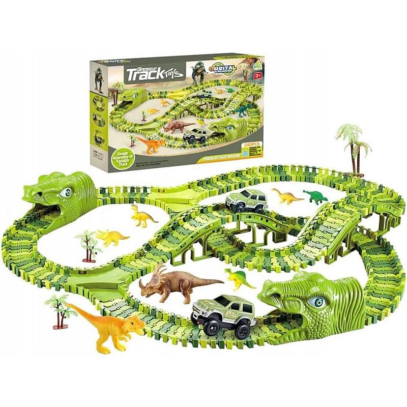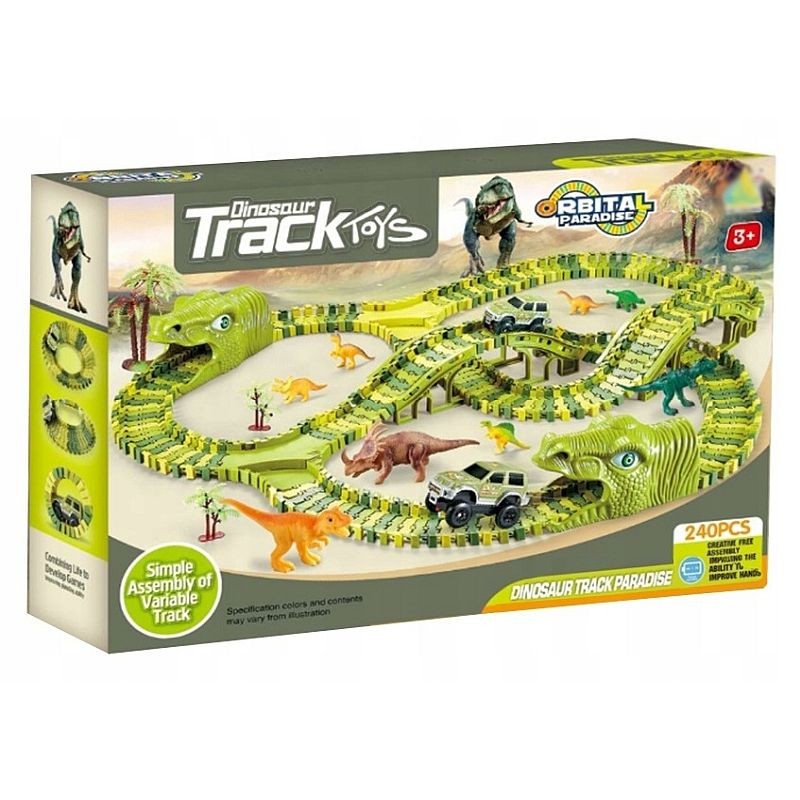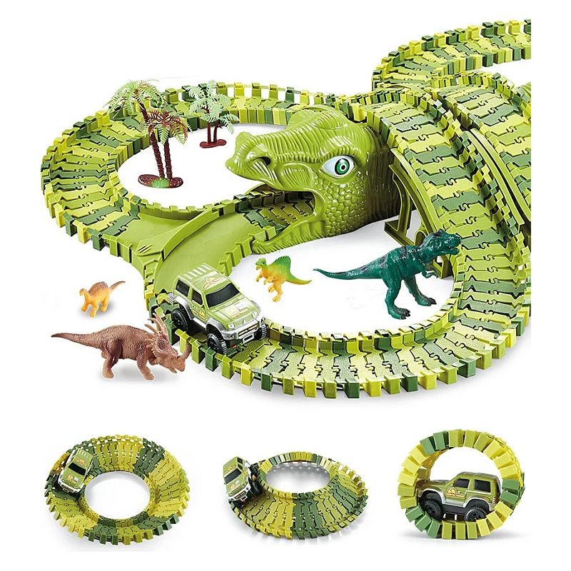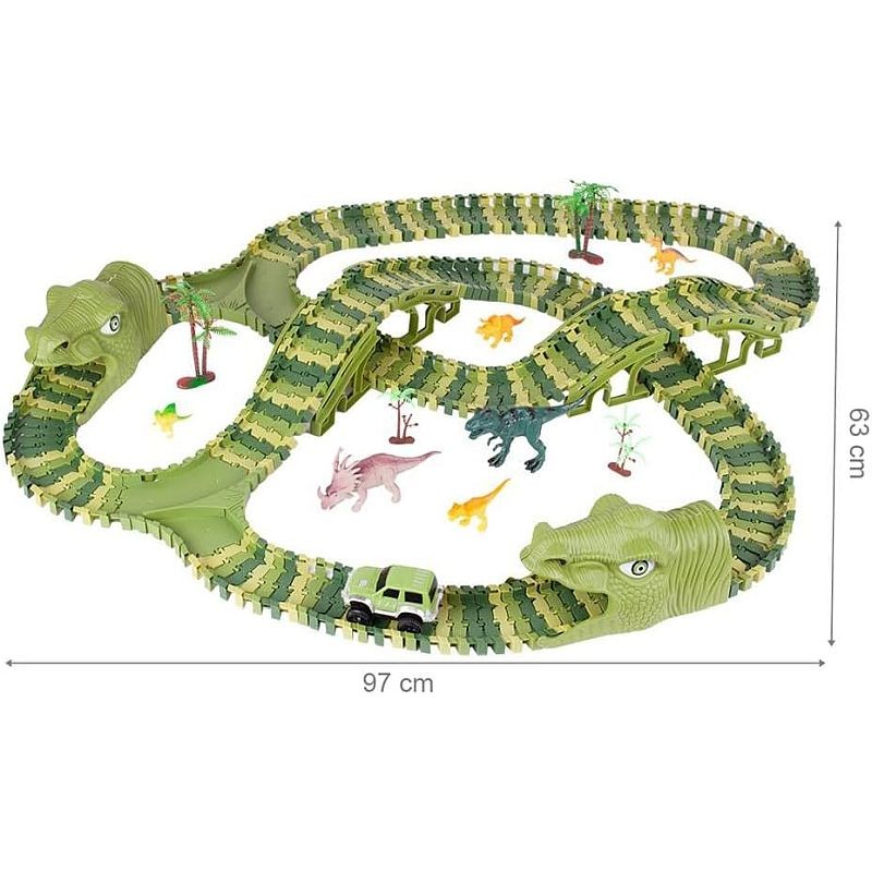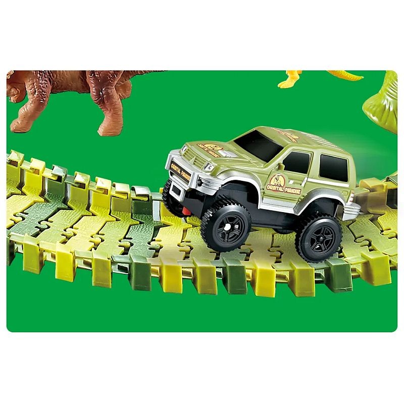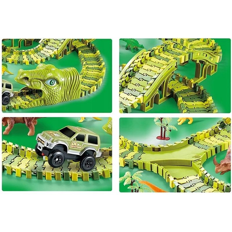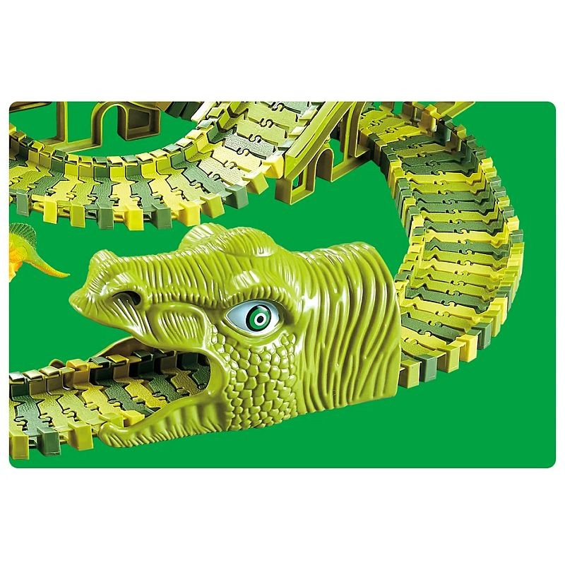 Masinuta strabate un circuit impresionant cu doua tuneluri sub forma de capete de dinozaur si doua poduri intr-un decor desprins din povesti. Este alimentata de 1 baterie AA de 1,5 V datorita careia se deplaseaza independent pe pista. Pista este formata din 240 piese flexibile, usor de asamblat prin intermediul unor rosturi mici plasate pe margini. Traseul poate fi modificat oricand, obtinand un alt tip de circuit si oferind o varietate de jocuri. Astfel, puteti realiza o pista circulara, dreapta sau una cu bucla pe care masina se va deplasa fara probleme. Pe langa cele 240 de piese care formeaza circuitul, setul include 2 tuneluri capete de dinozauri, 1 masinuta electrica, 8 structuri de pod, 2 intersectii, 8 dinozauri de diferite dimensiuni si specii, 4 copaci diferiti.