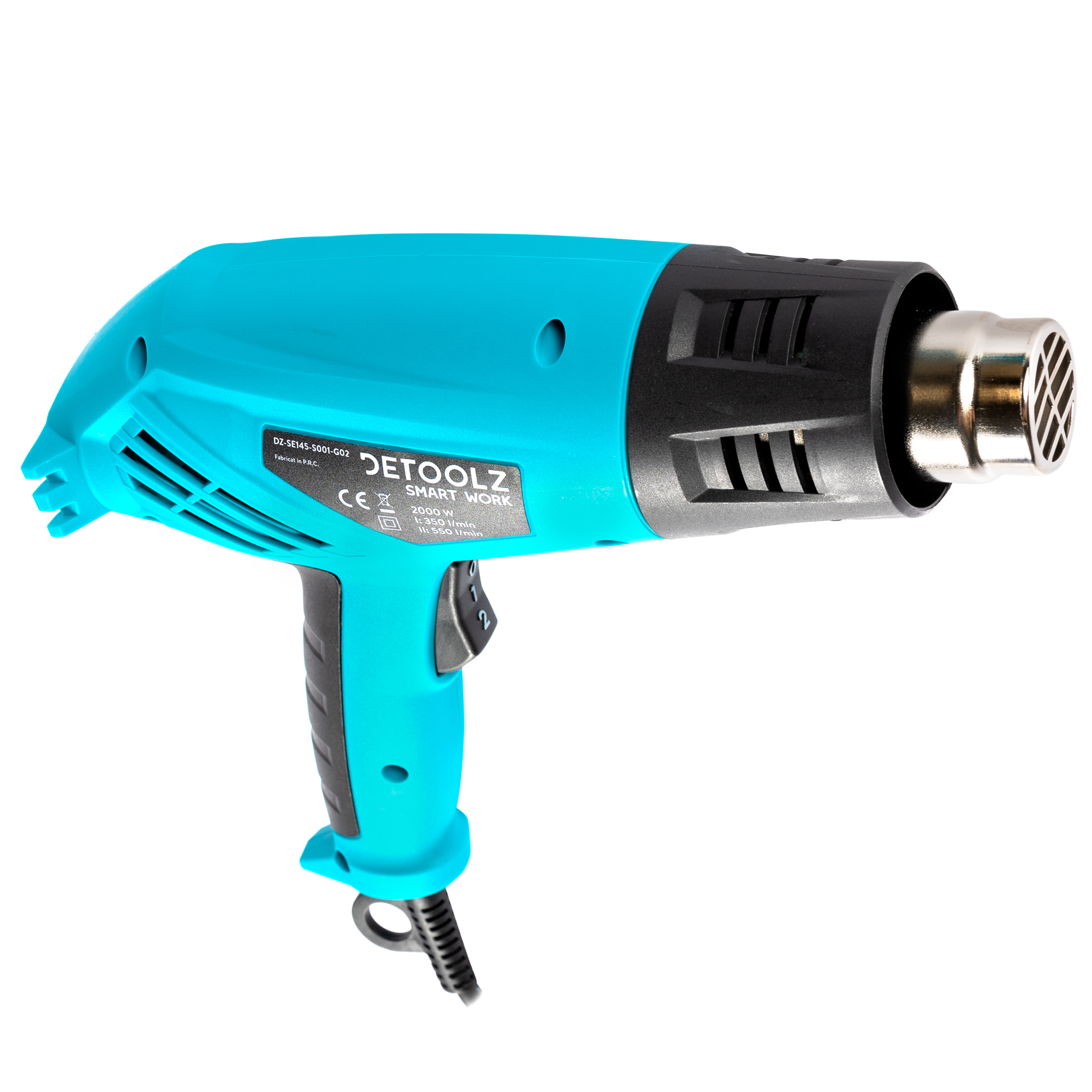 Pistolul electric cu aer cald Detoolz DZ-SE145-S001-G02 este un produs de uz gospodăresc, destinat pentru operațiile de desprindere a vopselei, îmbinarea țevilor, contractarea PVC, îmbinarea și îndoirea obiectelor din plastic, precum și utilizarea pentru uscare și dezghețare în general.