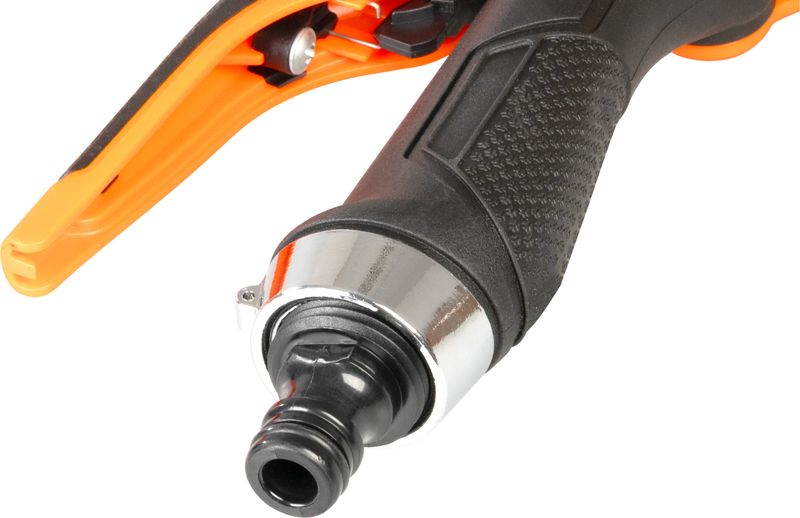 Designul ergonomic, cu maner anti-alunecare si declansator confortabil, asigura o utilizare placuta chiar si in sesiunile mai lungi. Sistemul de blocare a manetei permite udare continua fara a tine apasat permanent, iar reglarea debitului de apa ajuta la adaptarea jetului in functie de suprafata sau tipul plantelor.