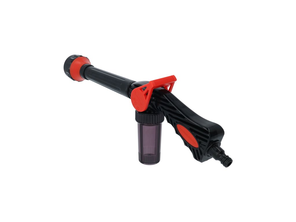Mod de utilizare: conectează pistolul la un furtun compatibil, adaugă șampon auto lichid în rezervor dacă dorești funcția de spumă, apoi selectează tipul de pulverizare potrivit. Reglează debitul din clapetă și clătește sau spumează suprafața dorită pentru o curățare eficientă.