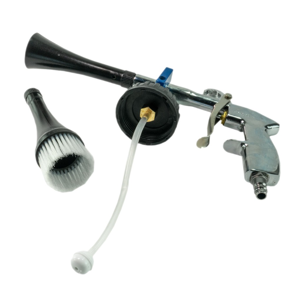 Cum se foloseste: conecteaza pistolul la compresor prin cupla 1/4", umple rezervorul cu solutie potrivita (detergent/solutie de detailing), apoi pulverizeaza pe suprafata si lucreaza zona. Pentru detalii, foloseste duza cu perie. Recomandat sa testezi solutia pe o zona mica inainte.