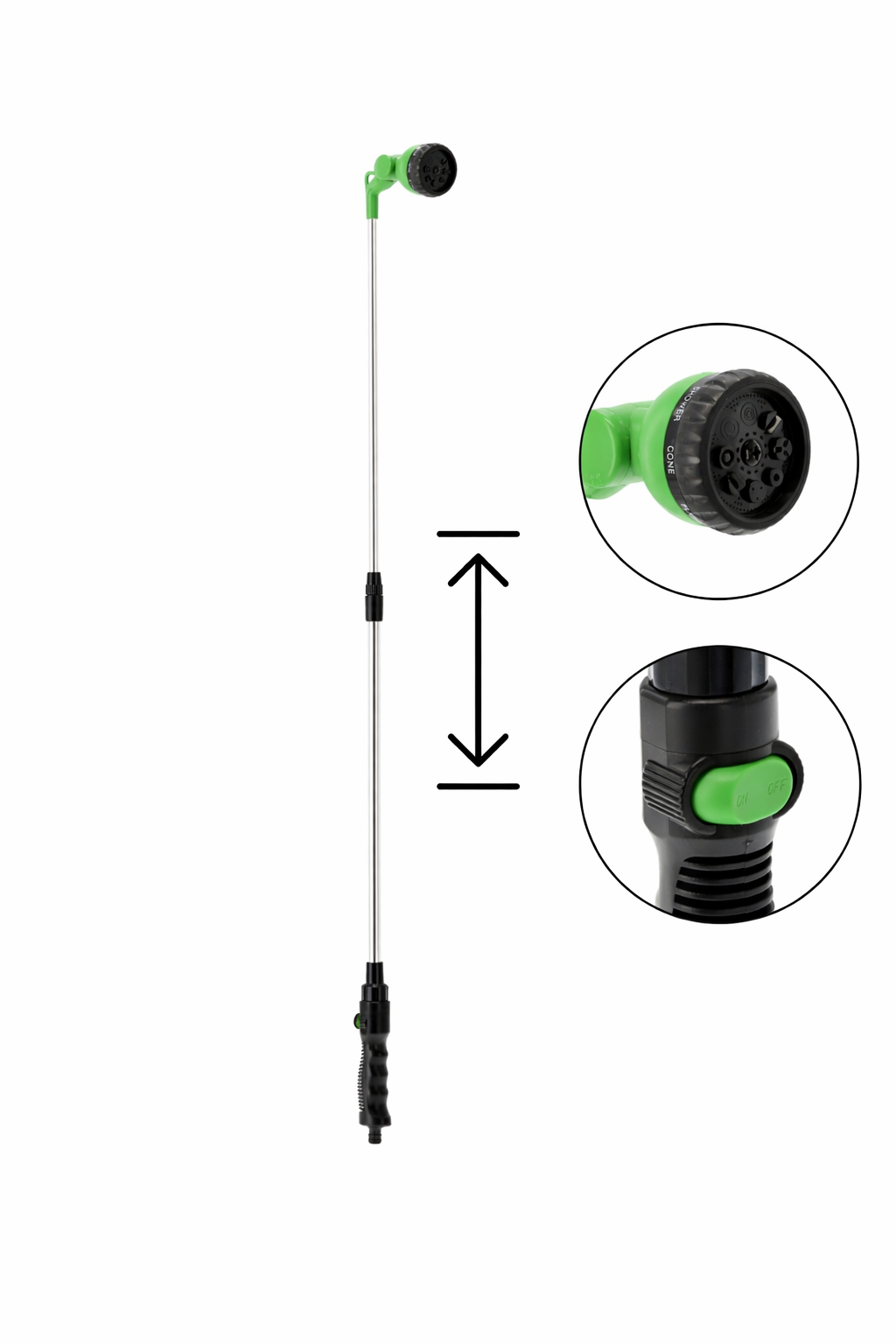 Mod de utilizare: conectează pistolul la furtunul compatibil, reglează lungimea dorită între 71 și 106 cm și selectează tipul de pulverizare potrivit. Folosește un jet fin pentru plante sensibile și un jet mai puternic pentru suprafețe mai mari sau pentru curățare ușoară în exterior.