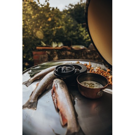 Placa de foc Monolith are multe utilizări. Transformați Monolith-ul CLASSIC într-un grătar foarte special. Placa masivă de oțel cu o grosime de 5 mm stochează căldura foarte bine, astfel încât să puteți pregăti o masă completă pe ea. Bucăți mari de carne, mâncăruri diverse, pește, deserturi, aveți aproape toate opțiunile deschise. Placa de foc este realizată special pentru Monolith Classic și are o etanșare pe partea inferioară a marginii ceramice. În centrul plăcii se poate instala capacul ventilului clasic, astfel încât să puteți continua să reglați perfect temperatura. Pe spatele plăcii există o adâncitură, astfel încât capacul grătarului nu trebuie dezasamblat. Placa de foc se extinde lateral la câțiva centimetri dincolo de marginea grătarului astfel încât un gradient de temperatură să apară de la mijloc până la marginea plăcii. Astfel, puteți pregăti simultan cele mai diverse feluri de mâncare pe această placă. În zona fierbinte din zona centrală mâncarea poate fi gătită la temperaturi mai mari, în timp ce în zona exterioară mâncarea poate fi pur și simplu gătită lent, sau menținută la cald. Marginile plăcii sunt înălțate pentru a evita scurgerea lichidelor. Caracteristici:- Potrivită pentru CLASSIC Monolith