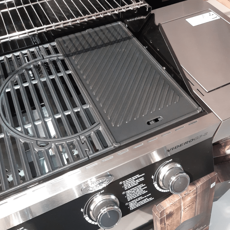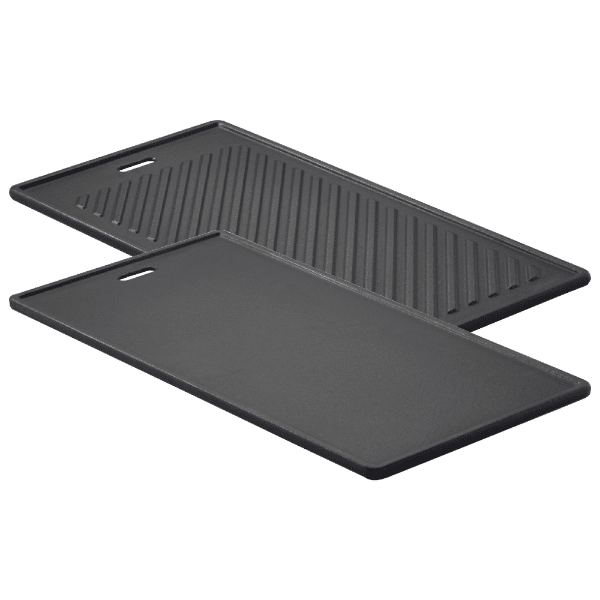 Este ideală pentru grătarele G2/G3/G4/G6 Videro modele începând cu anul de fabricație 2021. Dimensiuni 45 x 24 cm. Placa se poate utiliza pe ambele părți: partea netedă și partea striată. Partea netedă este ideală pentru prepararea de alimente precum creveți, medalioane, legume și multe altele. Partea striată va lăsa frumoase forme rombice pe carnea de gătit. Este ideală și pentru alimente grase precum pieptul de rață sau burta de porc, deoarece grăsimea nu se va scurge din tavă pe flacără, datorită marginilor ridicate. Suportă temperaturi ridicate de până la 400°.Caracteristici: