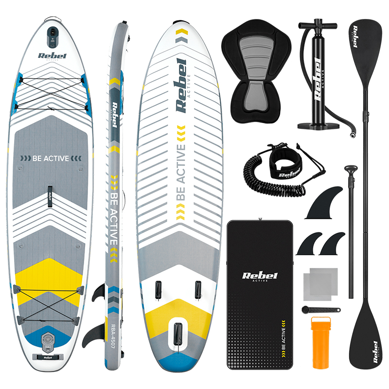 Setul include: 3 x aripioare, cordon de siguranță, vâslă, scaun caiac, pompă de mână, rucsac de transport, kit de reparații
