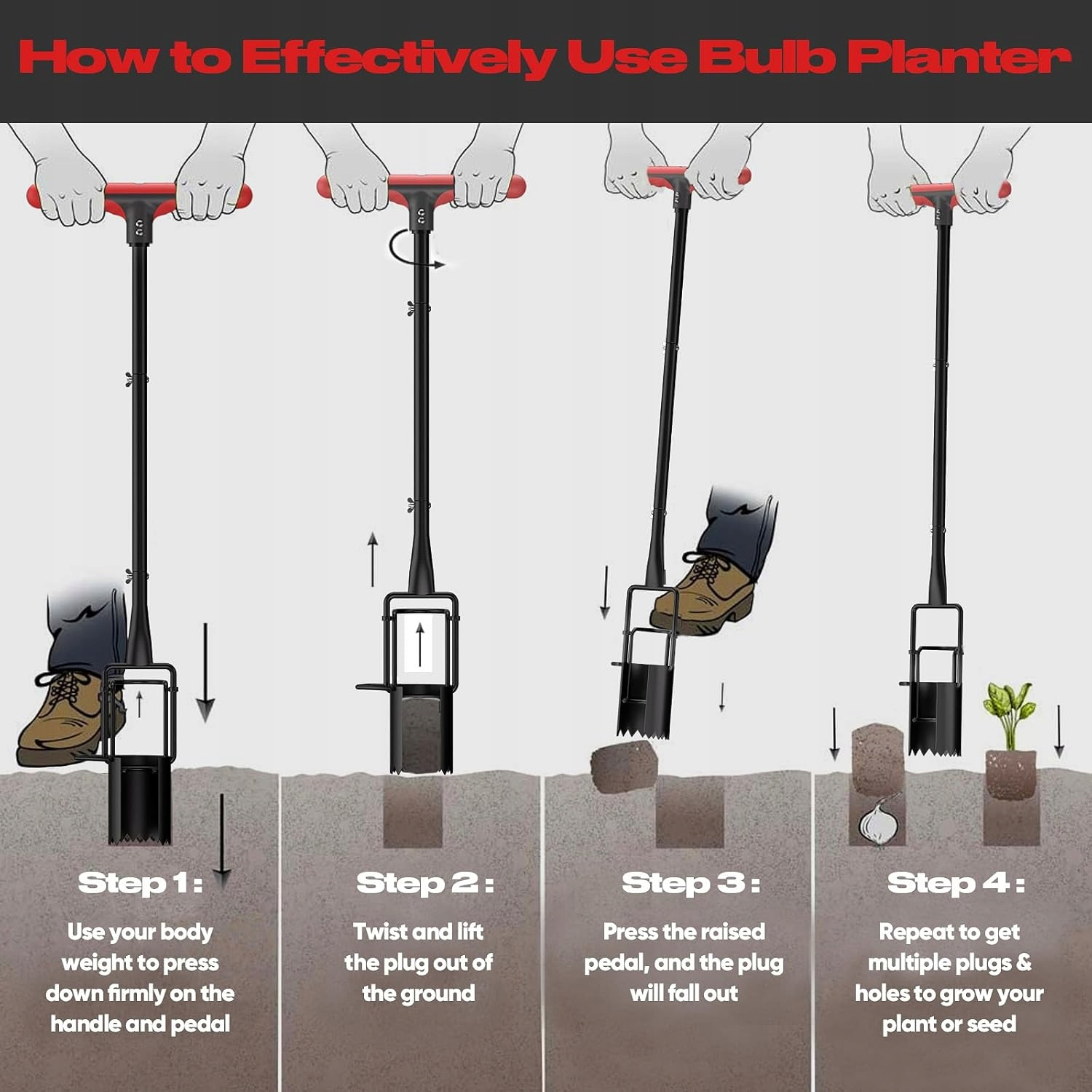 Mod de utilizare: pozitionezi plantatorul in locul dorit, il introduci in sol prin apasare, apoi formezi spatiul necesar pentru rasad. Dupa amplasarea plantei, continui procesul rapid si uniform pe toata suprafata de lucru.