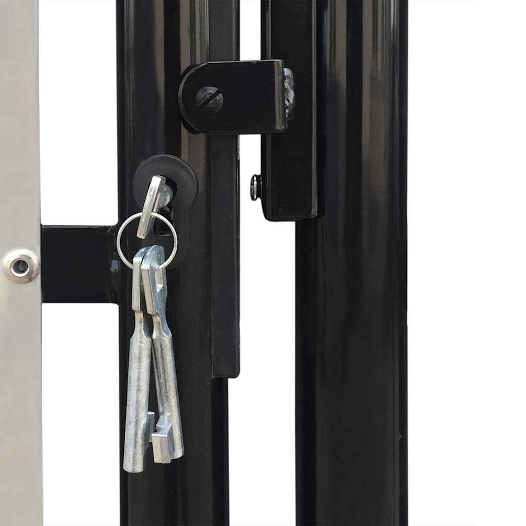 Poarta are doi stâlpi solizi cu balamale robuste pentru o instalare ușoară, precum și un sistem de închidere rezistent cu 3 chei potrivite ce sunt incluse în livrare. Această poartă pentru grădină reprezintă o combinație grozavă de stil, forță, stabilitate și rezistență la coroziune!