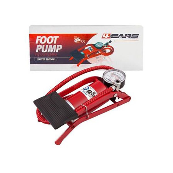 Pompa de picior cu manometru si un cilindru, se actioneaza cu ajutorul piciorului si este prevazuta cu trei adaptoare cu ajutorul carora se pot umfla anvelopele autoturismelor, motocicletelor, bicicletelor, mingi sau barci pneumatice.