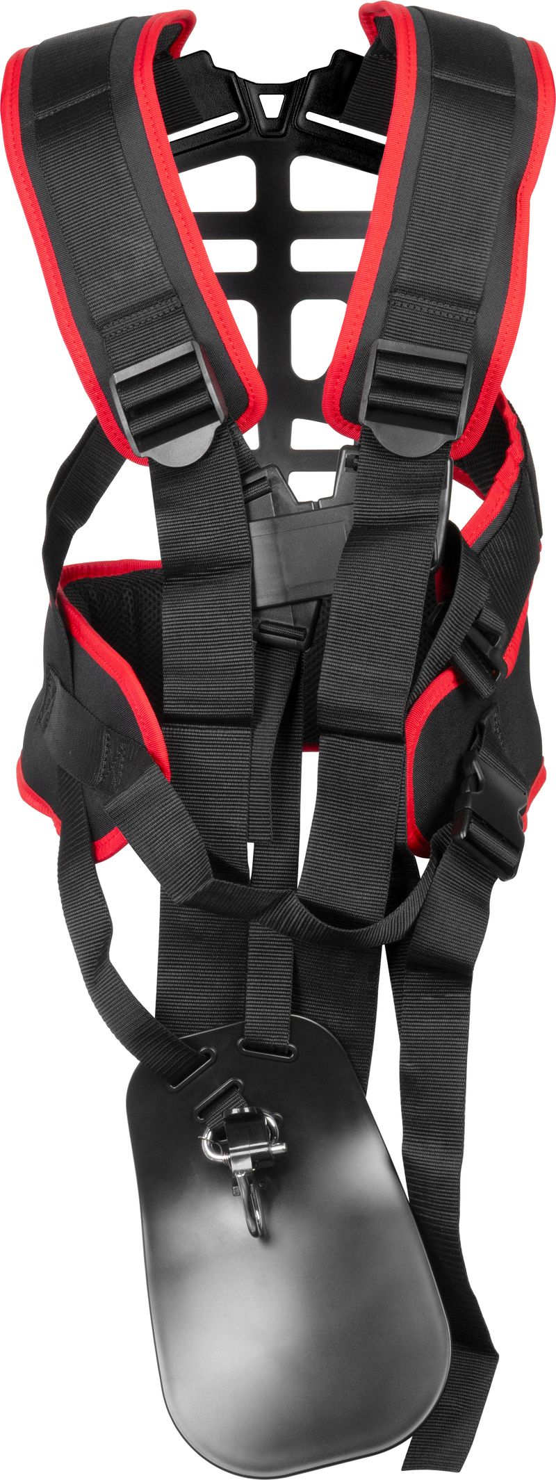 Popruh je navrhnutý s dôrazom na ergonómiu a stabilitu. Nastaviteľné ramenné popruhy umožňujú prispôsobenie rôznym typom postavy, čím sa zvyšuje komfort pri kosení a presnosť ovládania stroja. Robustné prevedenie zabezpečuje spoľahlivé držanie krovinorezu počas celej práce.