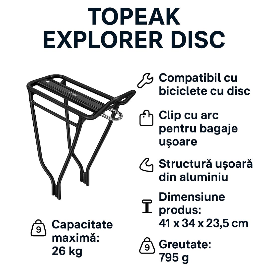Topeak Explorer (Disc) este portbagajul spate ideal pentru bicicletele echipate cu frane disc si roti intre 26 si 29 inch. Fabricat din aluminiu 6061 T6 tubular, ofera un echilibru excelent intre rezistenta si greutate, fiind perfect pentru naveta zilnica, trasee lungi si utilizare intensa in oras sau touring.