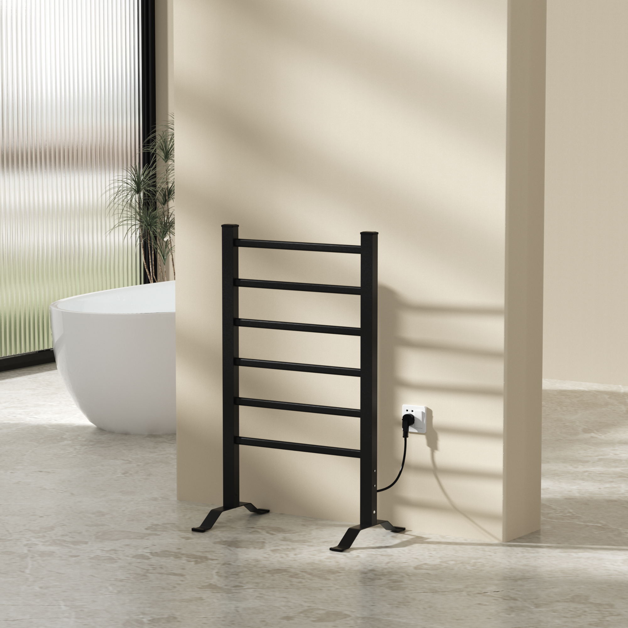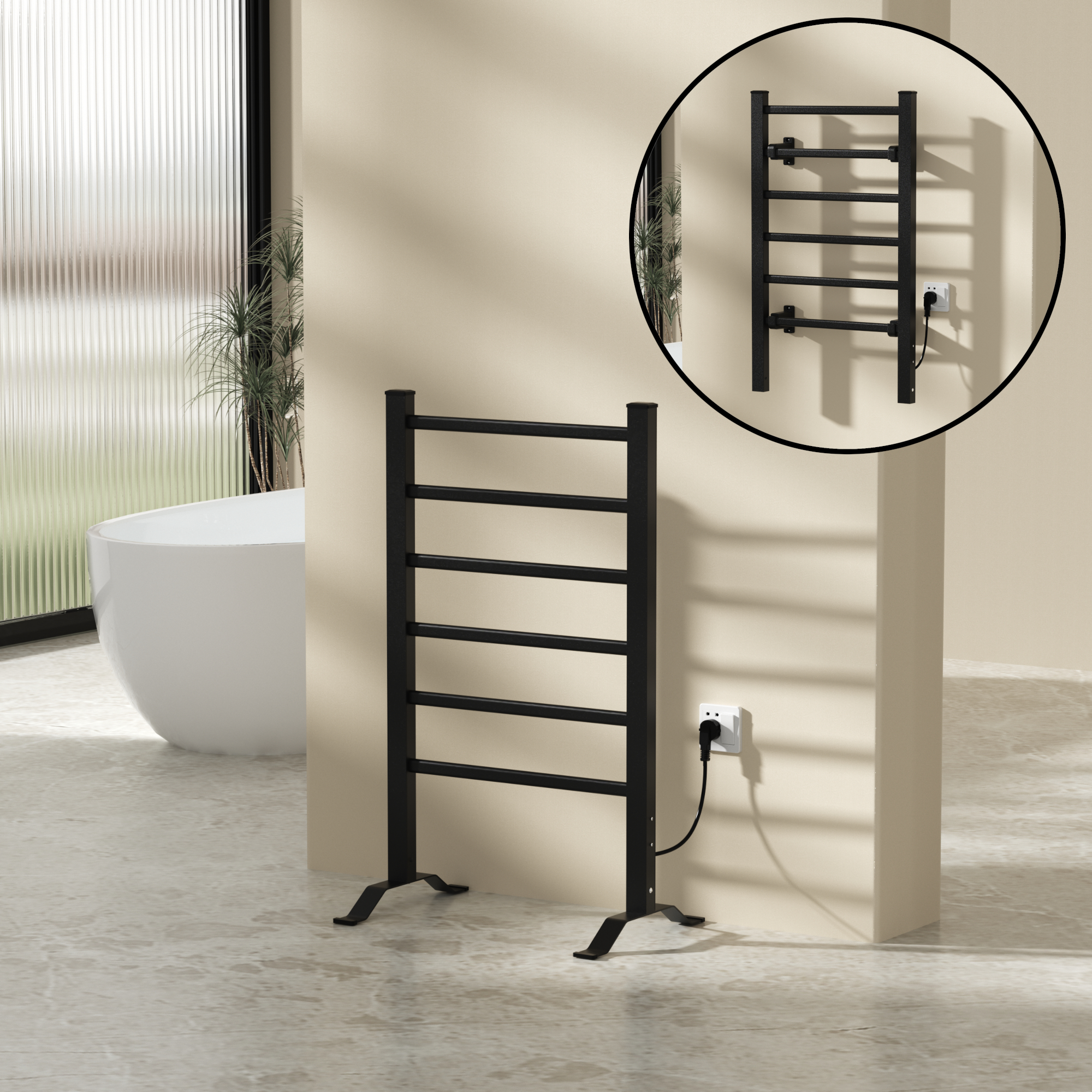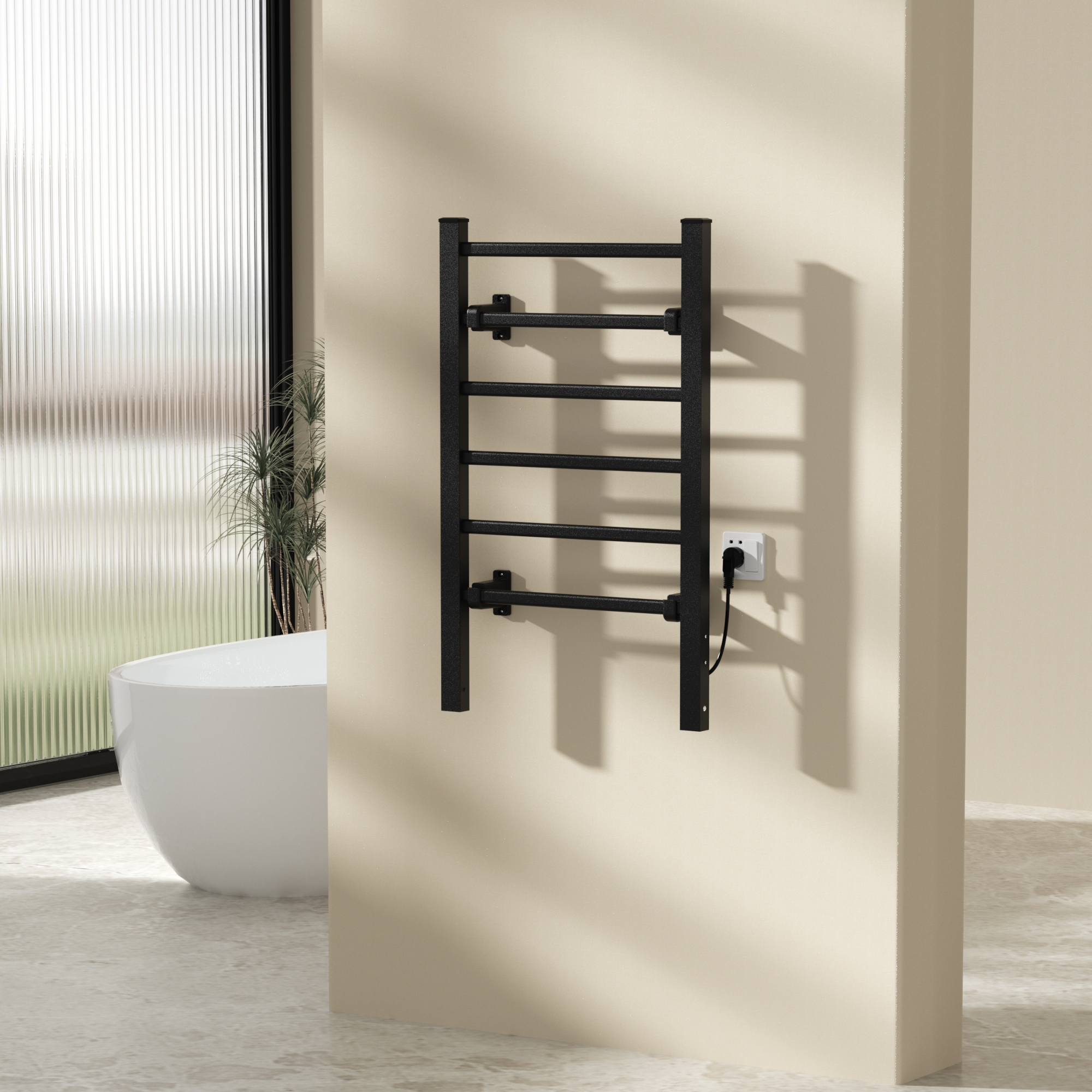 Datorită construcției înguste, acest uscător electric de prosoape economisește spațiu și se integrează ușor în băi mici sau medii. Poate fi folosit atât montat pe perete, cât și independent, cu ajutorul picioarelor incluse, oferind flexibilitate în funcție de amenajarea încăperii.
