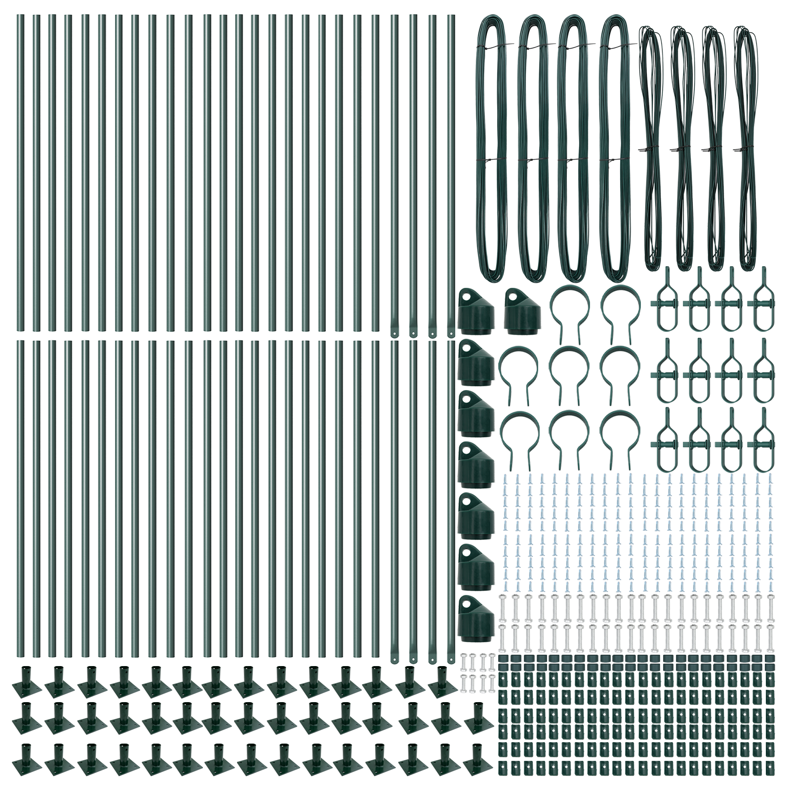 - Delivery Contains: 44 x Post, 8 x Angle post, 44 x Base plate, 44 x Plastic cap, 132 x Plastic tension wire supporter, 8 x Angle post cap, 8 x Angle post hardware, 12 x Tensioner, 4 x 25 m Binding wire, 4 x 80 m Tension wire