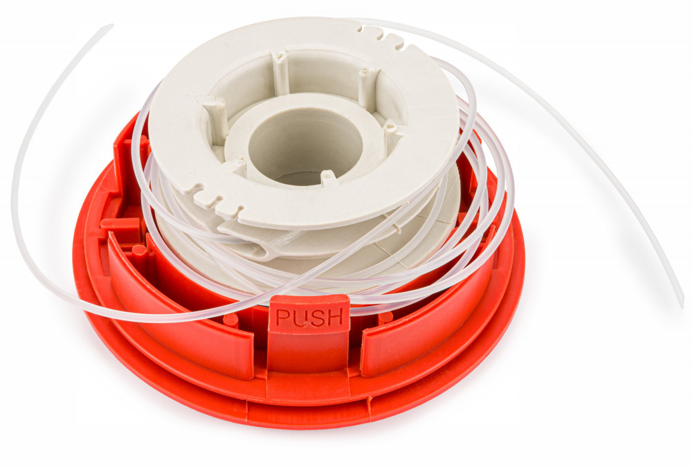 - Doar tăiați câțiva metri de linie, treceți-o prin ochiul corpului și înfășurați-o cu ajutorul butonului.