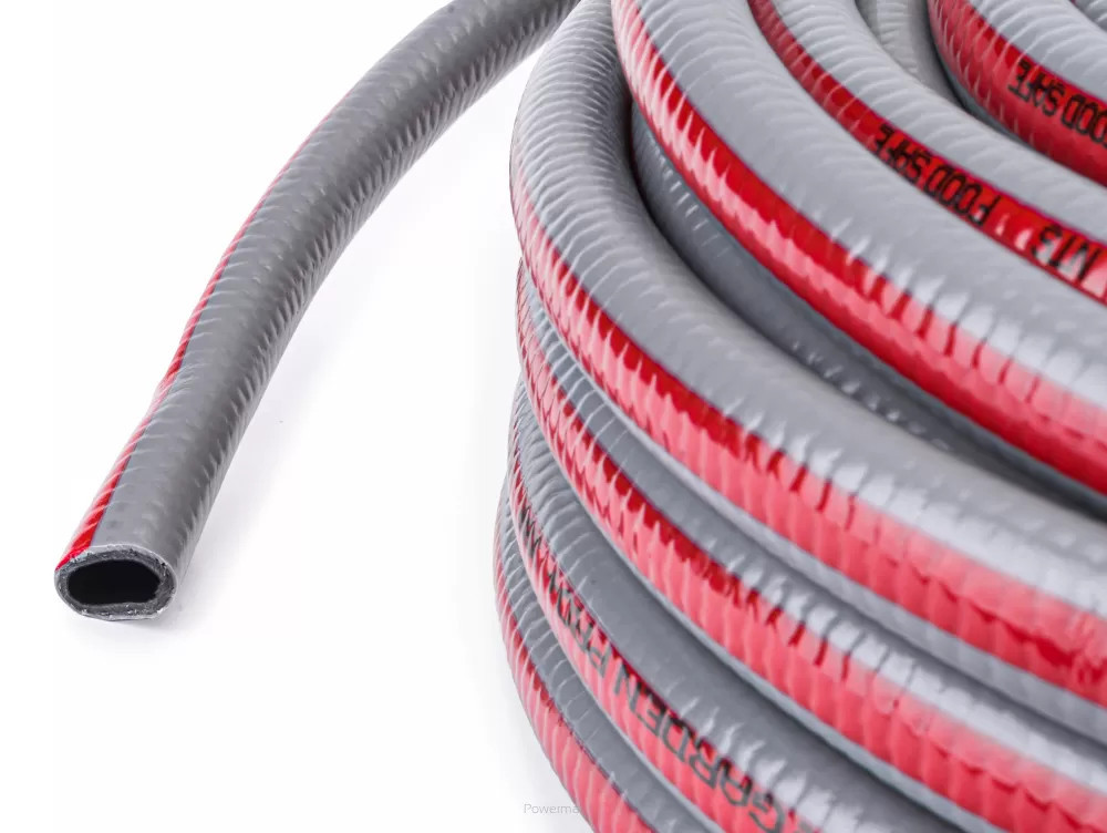 Furtunul este fabricat din material PVC extern de foarte înaltă calitate, rezistent la UV, împletitură încrucișată din fibră sintetică, strat extern flexibil din PVC și un strat adecvat pentru contactul cu alimentele.