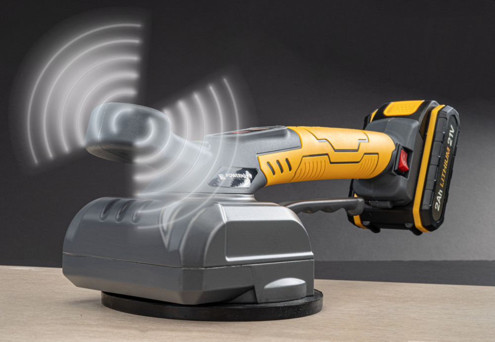 Alimentată de o baterie cu litiu de 21 V, ventuza PM-APWDP-80T poate fi utilizată atât pentru instalații interioare, cât și exterioare. Înlocuiește operațiunea manuală tradițională și ajută la evitarea problemelor cauzate de distribuirea incorectă a adezivului sub plăci și plăci mari. Forma specială și mânerul dublu permit menținerea echilibrului încărcăturii în timpul fazelor de ridicare și așezare a plăcilor și asigură un control mai bun al unității. Inserțiile soft-touch ale mânerului fac ca acesta să fie ergonomic, confortabil și sigur. Foarte compact și ușor, permite așezarea plăcilor prin ventuze (poate fi ridicat până la 80 kg ) și, datorită vibrațiilor, elimină bulele de aer reziduale care, dacă sunt încorporate între plăci, pot provoca posibile fisuri în adeziv și plăci. Intensitatea vibrației poate fi reglată prin apăsarea comutatorului.