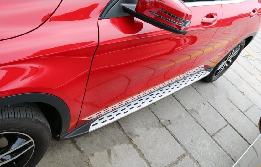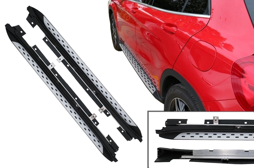 Set de praguri laterale pentru Mercedes GLA X156 (2014-2016), ideal pentru un plus de stil si acces mai usor in masina. Realizate din aluminiu, otel inoxidabil si PVC, aceste trepte laterale ofera un aspect modern SUV-ului si se livreaza ca set complet stanga-dreapta.