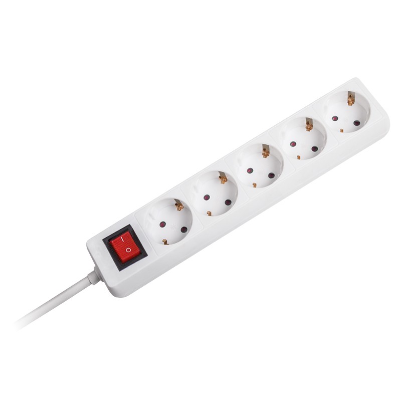 Prelungitor cu 5 prize cu pământare, tip german. Conceput pentru a lucra cu echipamente de birou și aparate de uz casnic. Datorită capacelor speciale din fiecare priză, prelungitorul poate fi utilizat în siguranță chiar și în încăperile în care sunt copii.