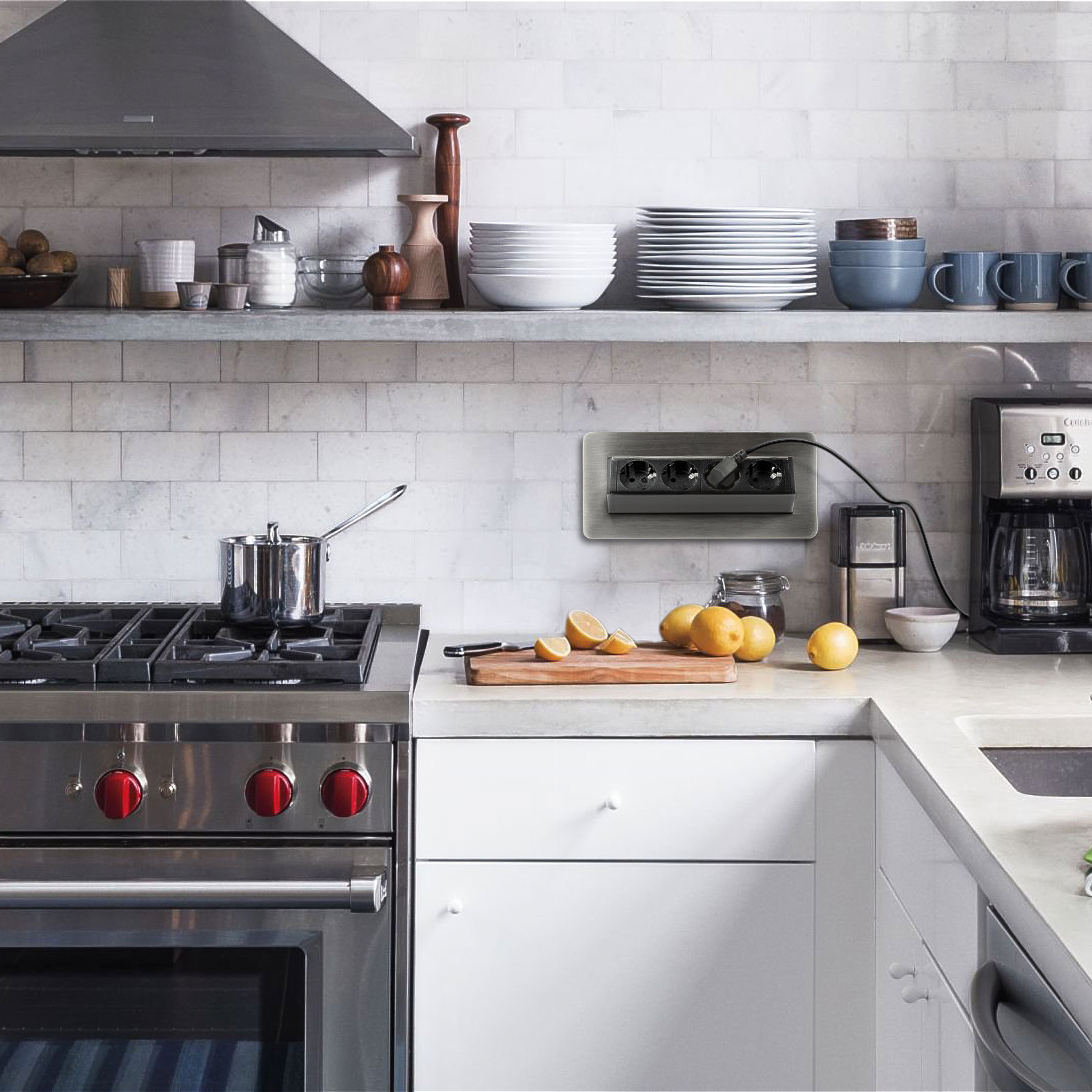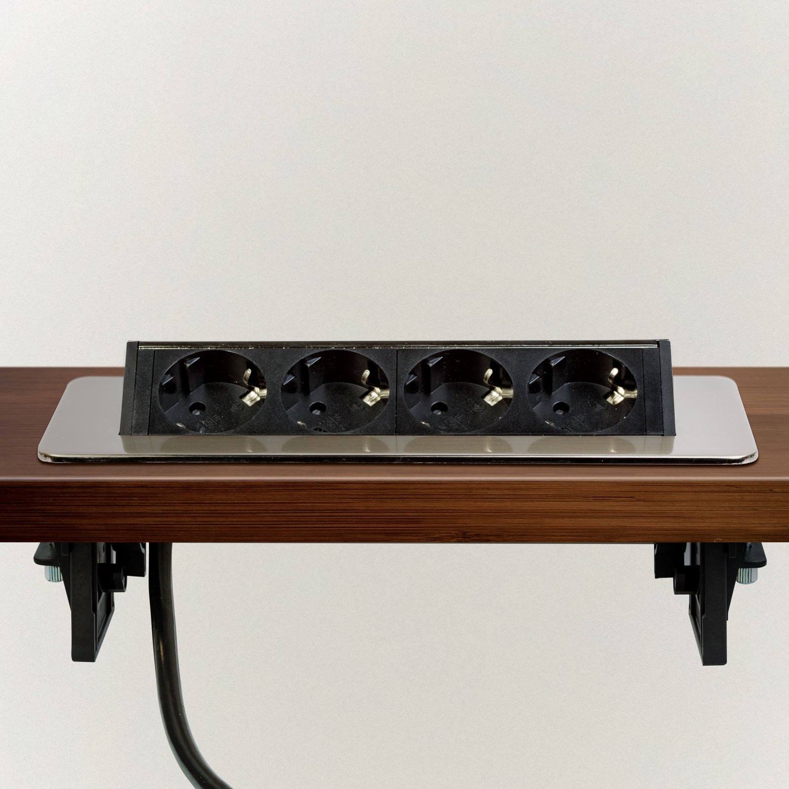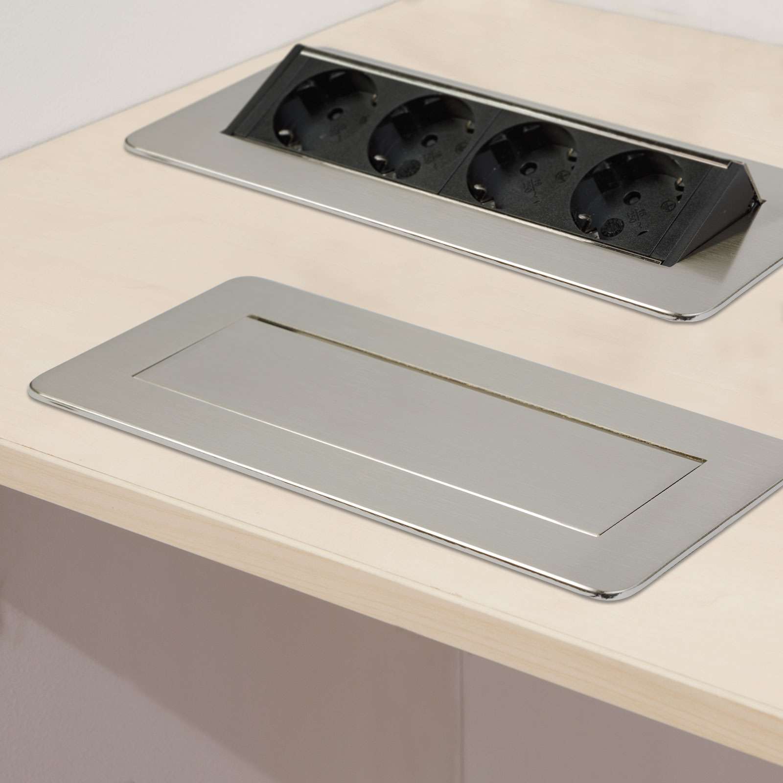 Dispune de 4 prize dotate cu protecție pentru copii, într-un corp rezistent realizat din metal și plastic de calitate. Sistemul de deschidere „flip-up” cu arc permite acces rapid la prize printr-o simplă apăsare, iar închiderea completă conferă un aspect ordonat și minimalist suprafeței de lucru.